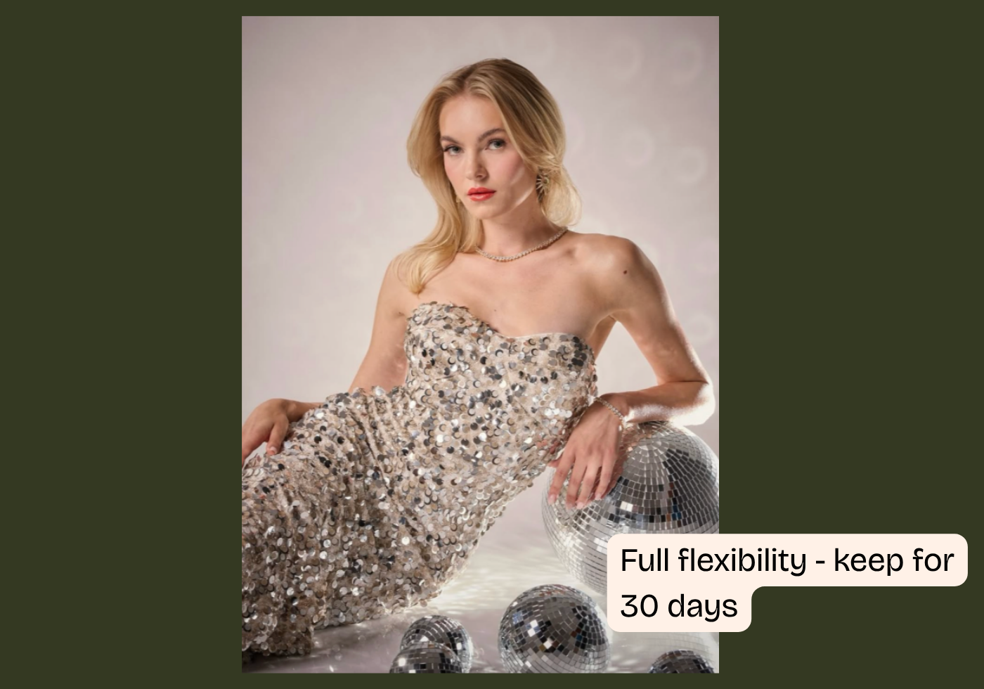 Rent items as a one-off. Perfect for nights out, weddings, vacations, and more. Just pick your outfit, choose your size, and check out. Get more with subscription!