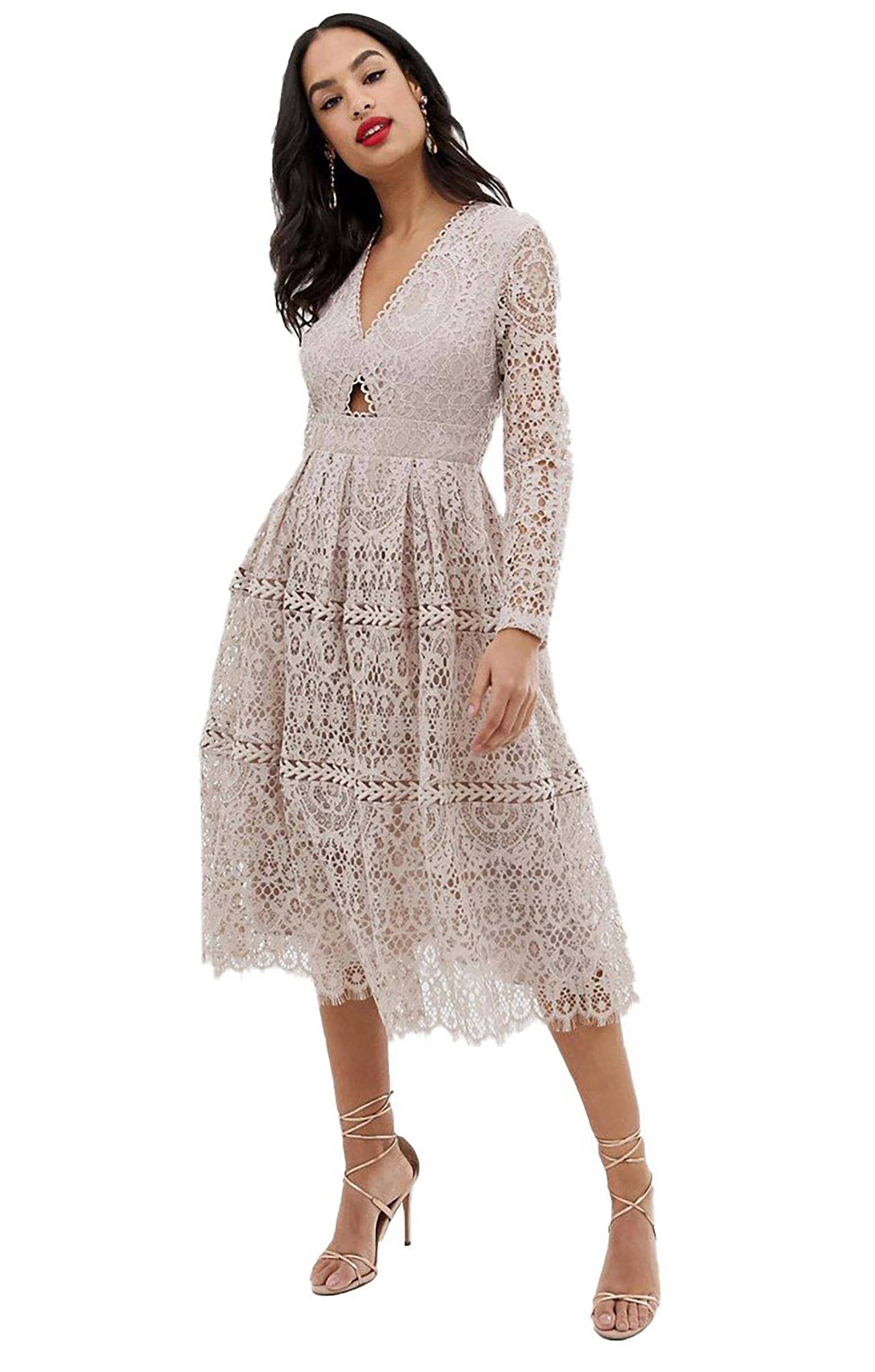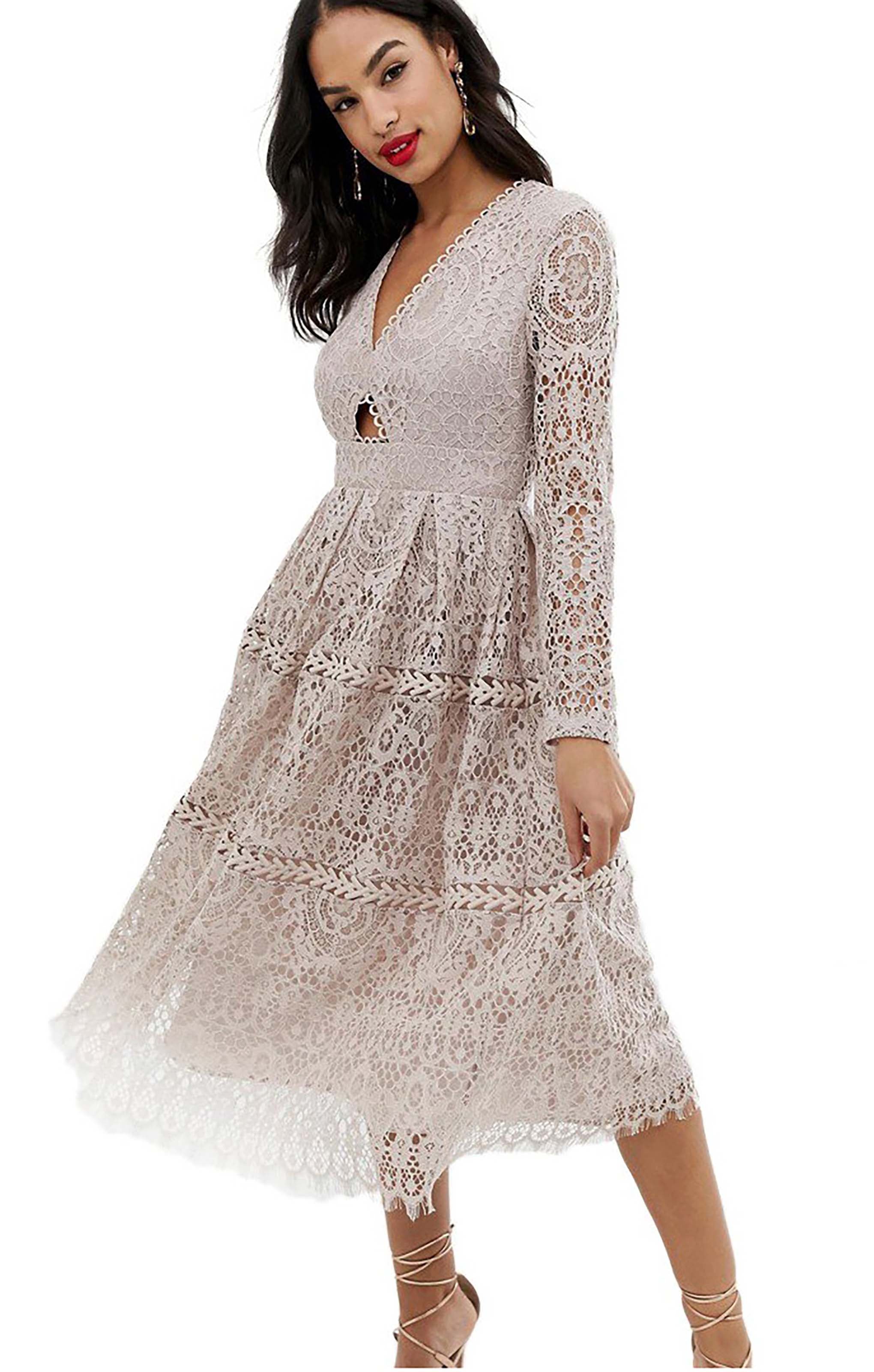 Elegant and timeless, this midi dress features intricate lace detailing and graceful long sleeves. Perfect for prom or special occasions, it offers a sophisticated silhouette with a romantic touch.