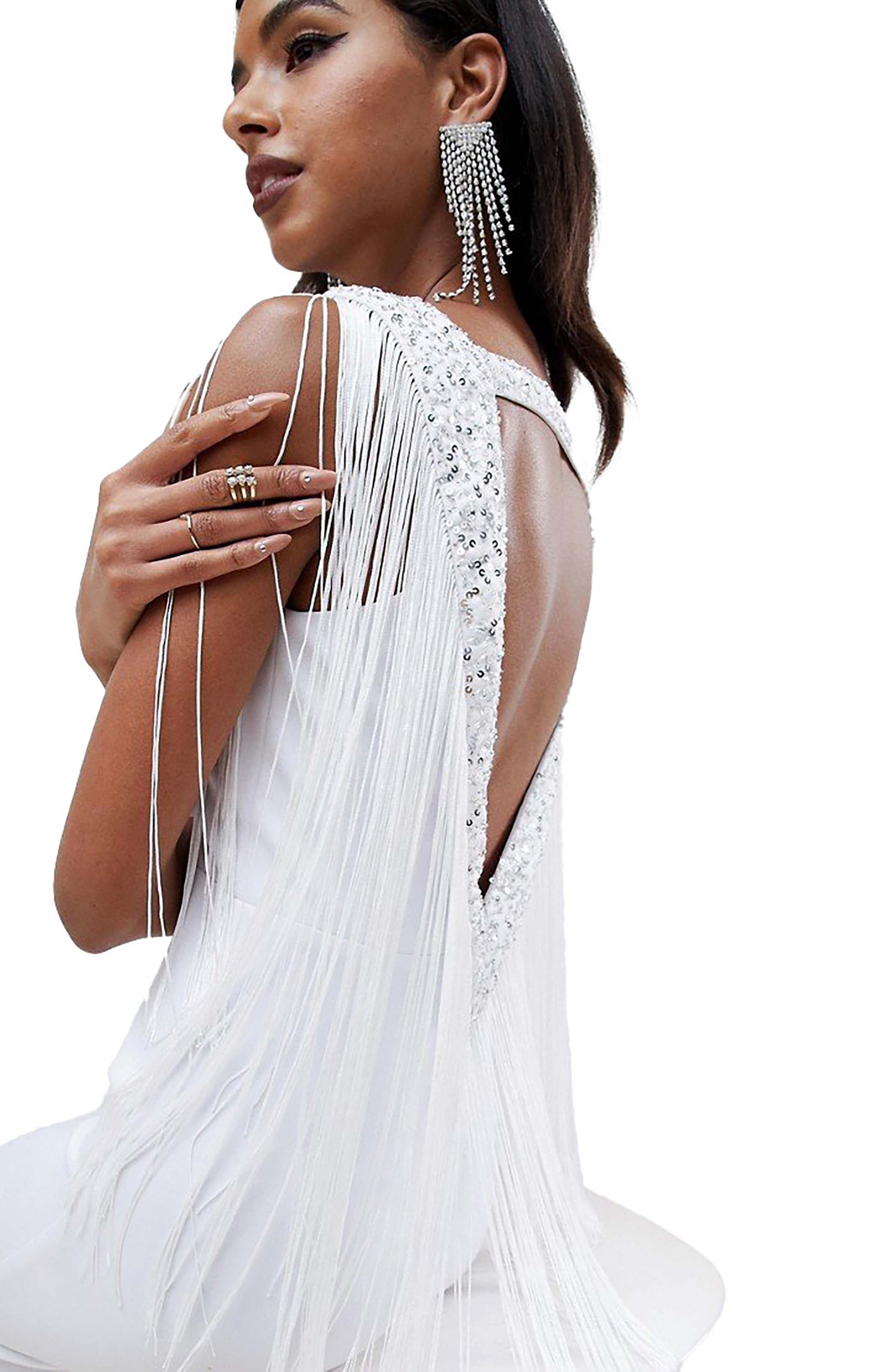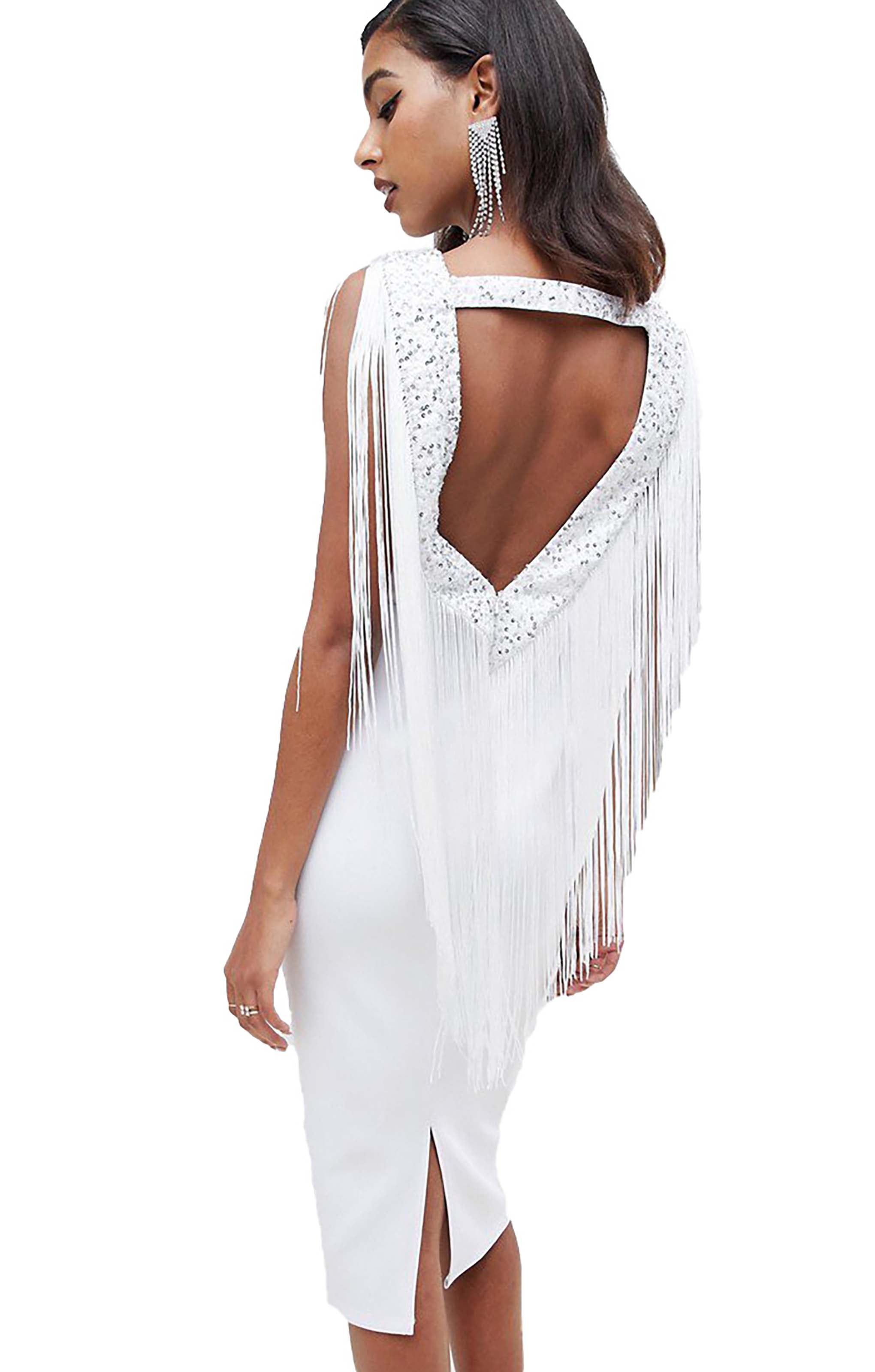 Shine in this embellished scuba fringe dress from ASOS DESIGN. Featuring sparkling embellishments and dynamic fringe detailing, the structured scuba fabric ensures a flattering fit while adding movement and flair — perfect for parties or evening events.