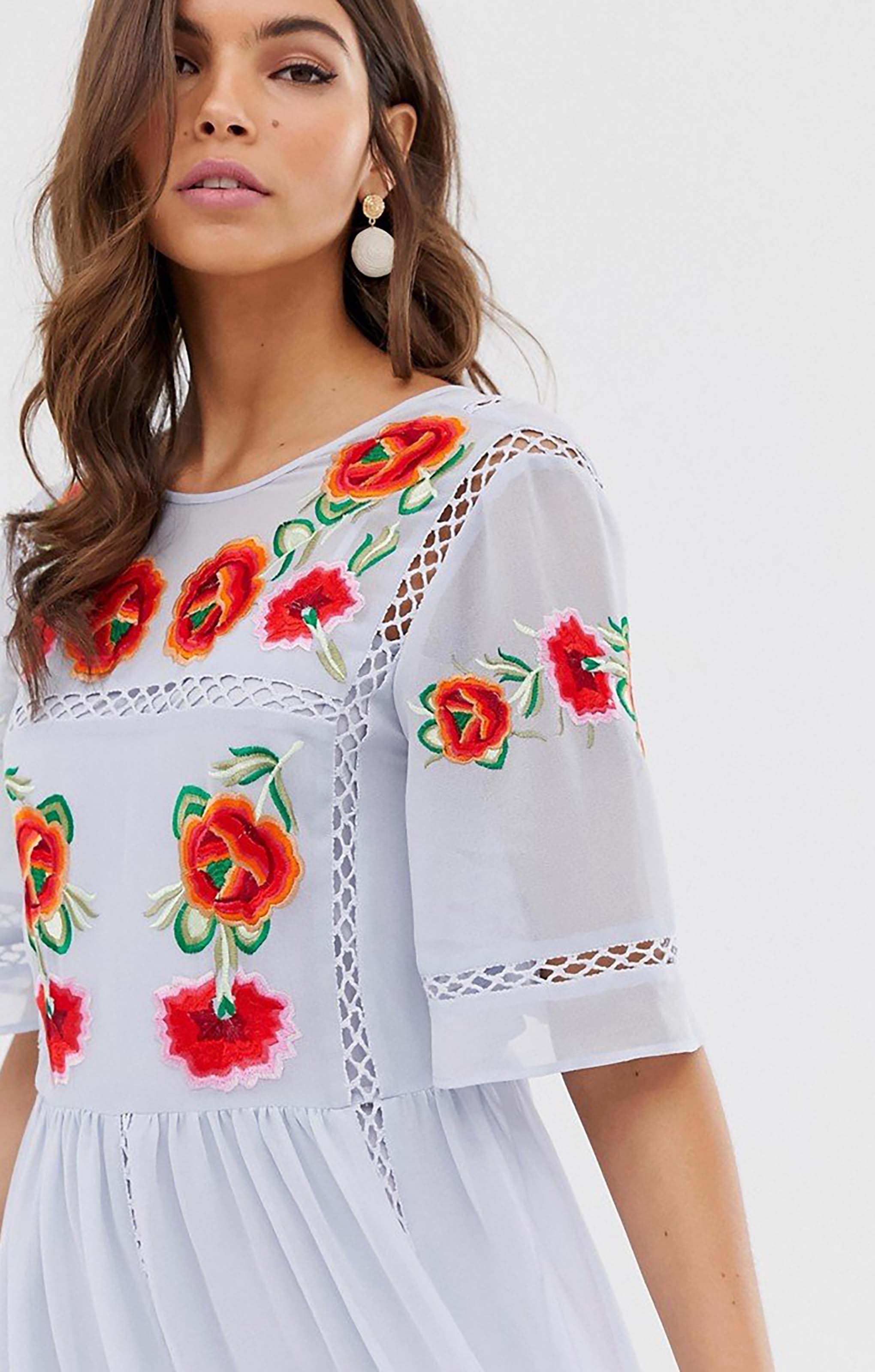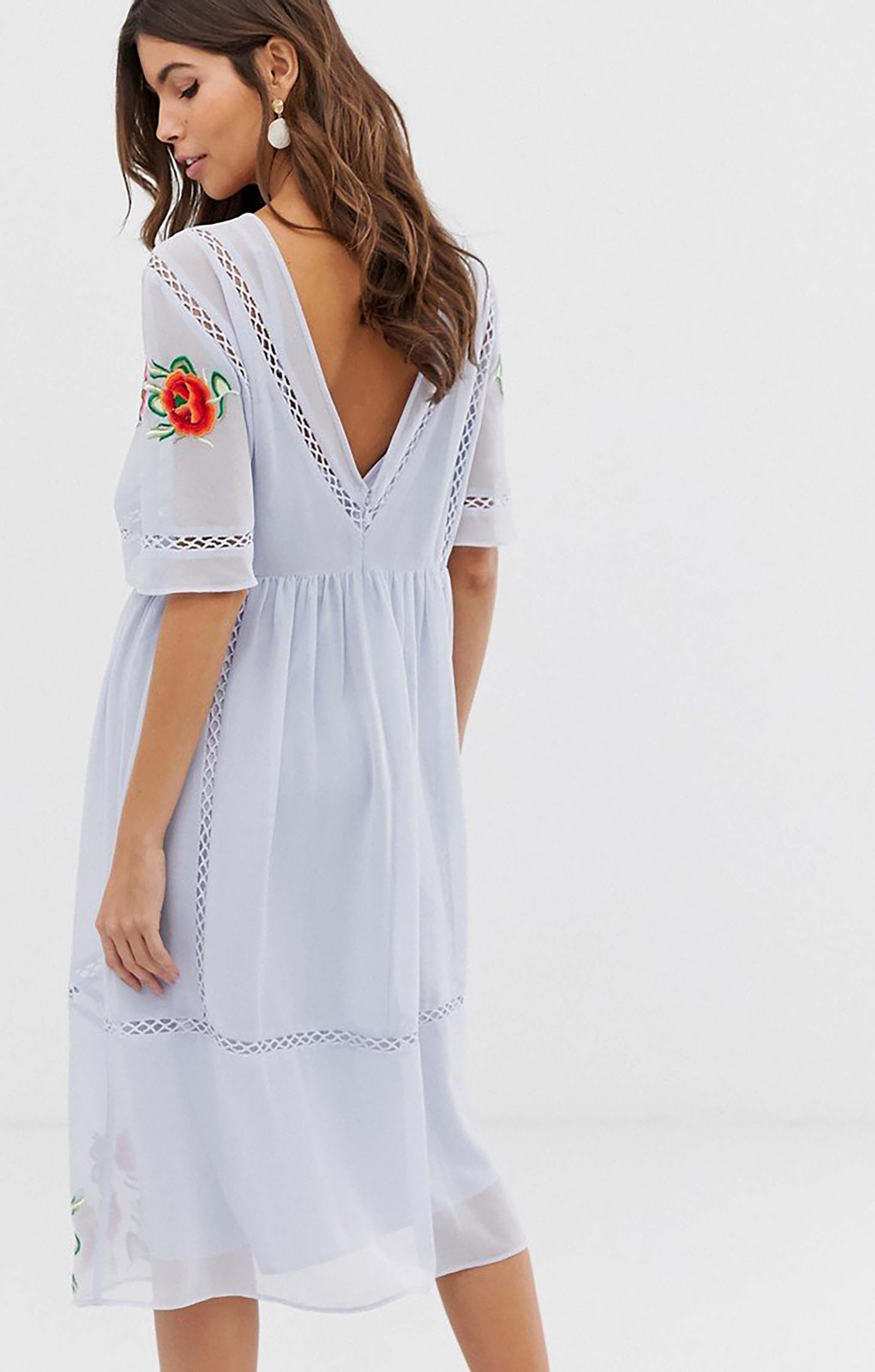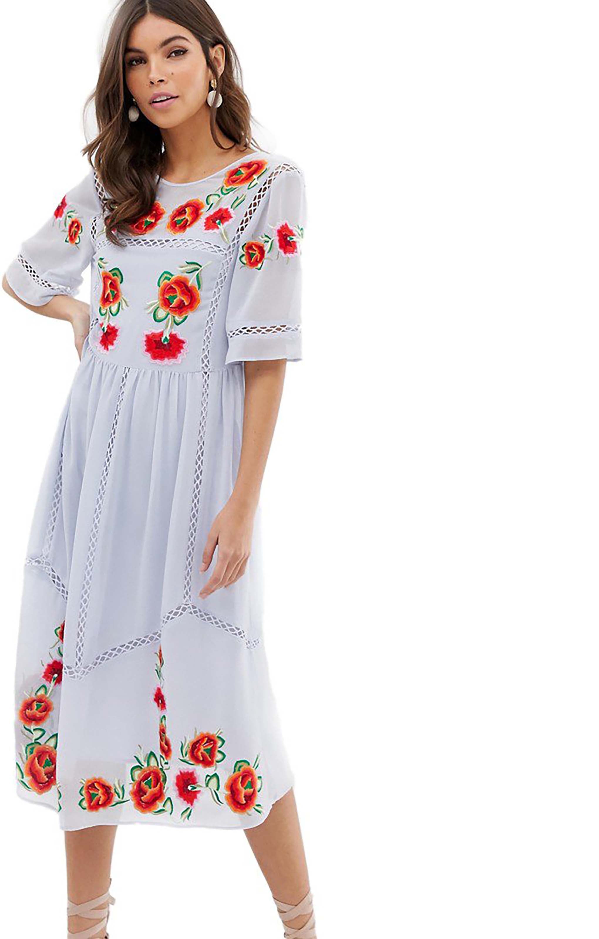 Effortless style meets subtle detailing with the ASOS DESIGN Embroidered Smock Midi Dress. Featuring delicate embroidery on a relaxed smock silhouette, this midi dress is perfect for casual outings, daytime events, or weekend gatherings. Its airy design offers comfort while keeping a feminine, stylish look.