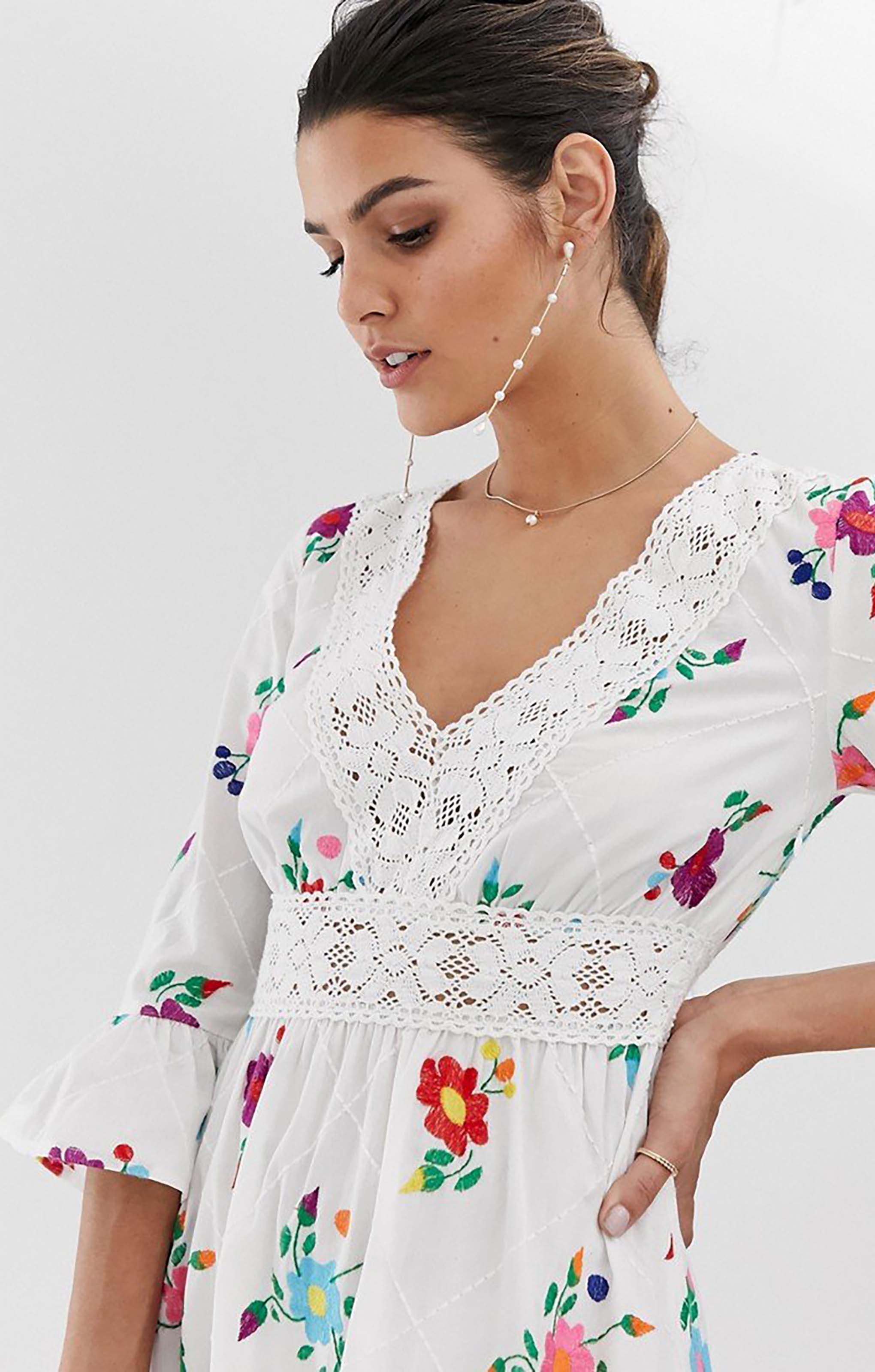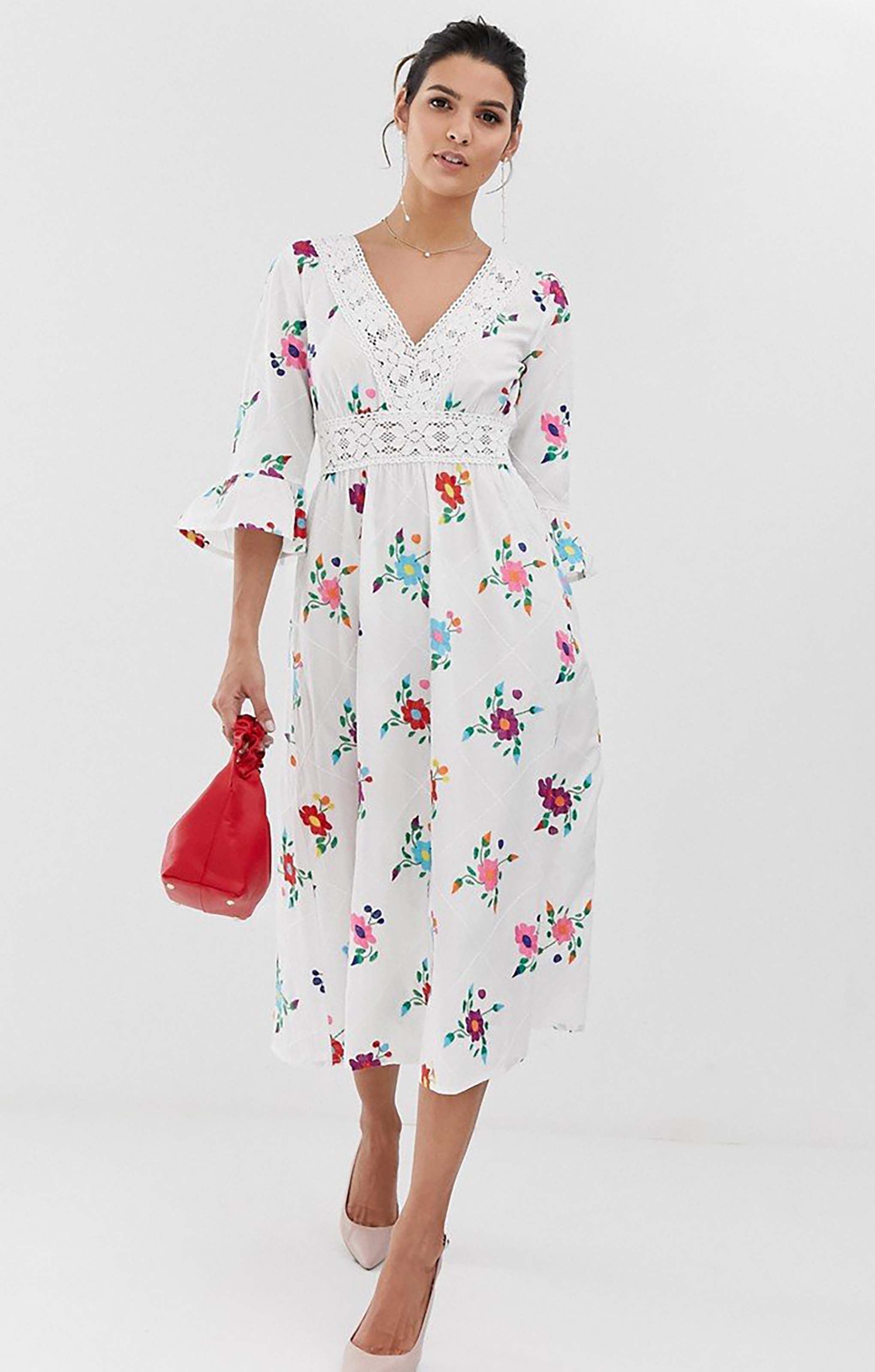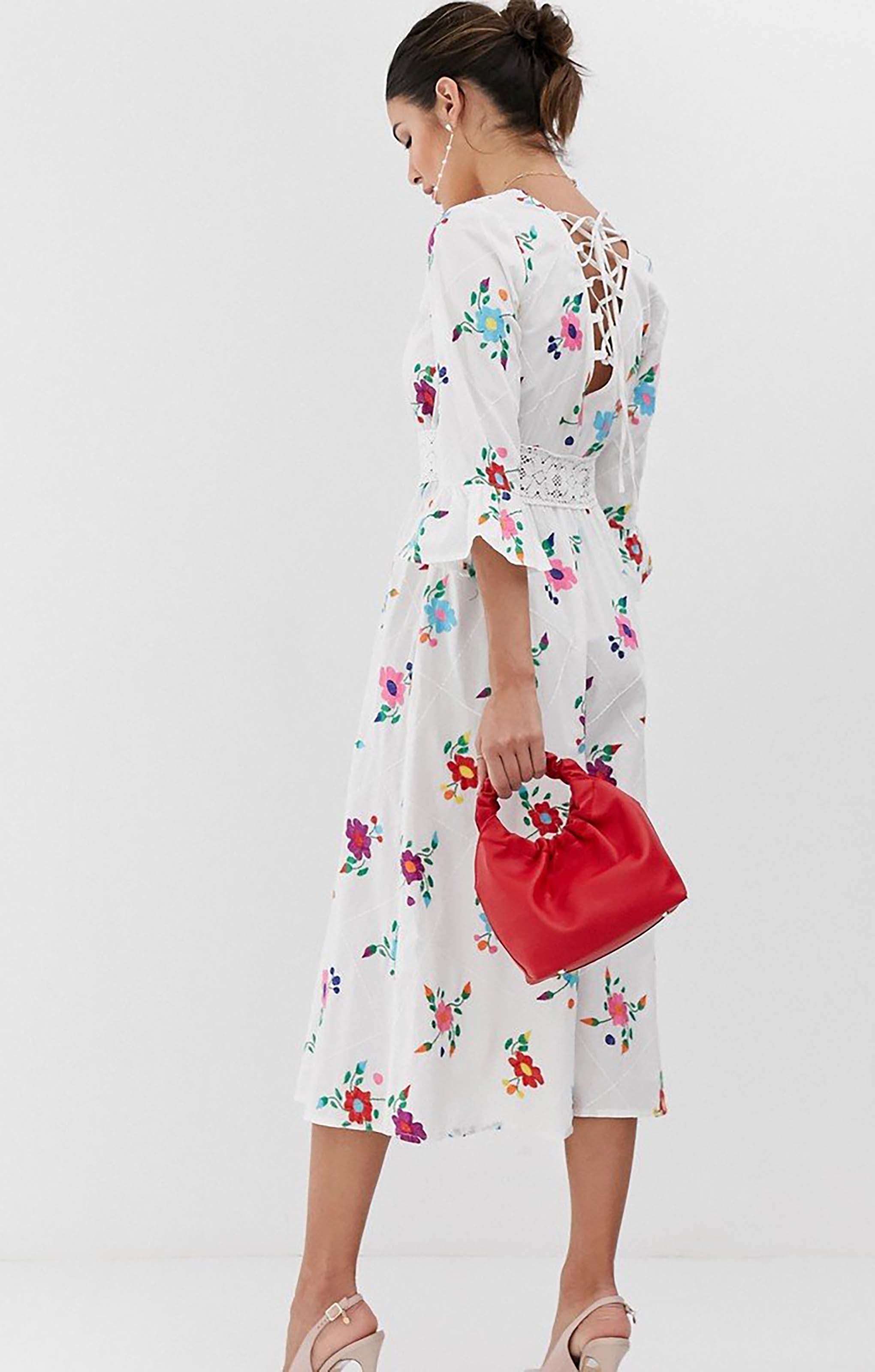 Make a statement in this ASOS DESIGN midi dress, featuring intricate embroidery and a chic lattice back detail. With a flattering silhouette and elegant midi length, it’s perfect for parties, weddings, or any occasion where you want to turn heads.