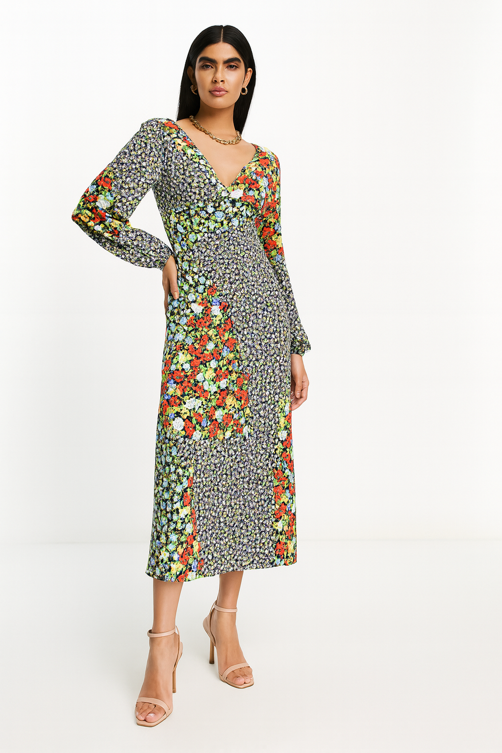 Asos Design Long Sleeve V Neck Midi Dress In Mixed Print Featuring: