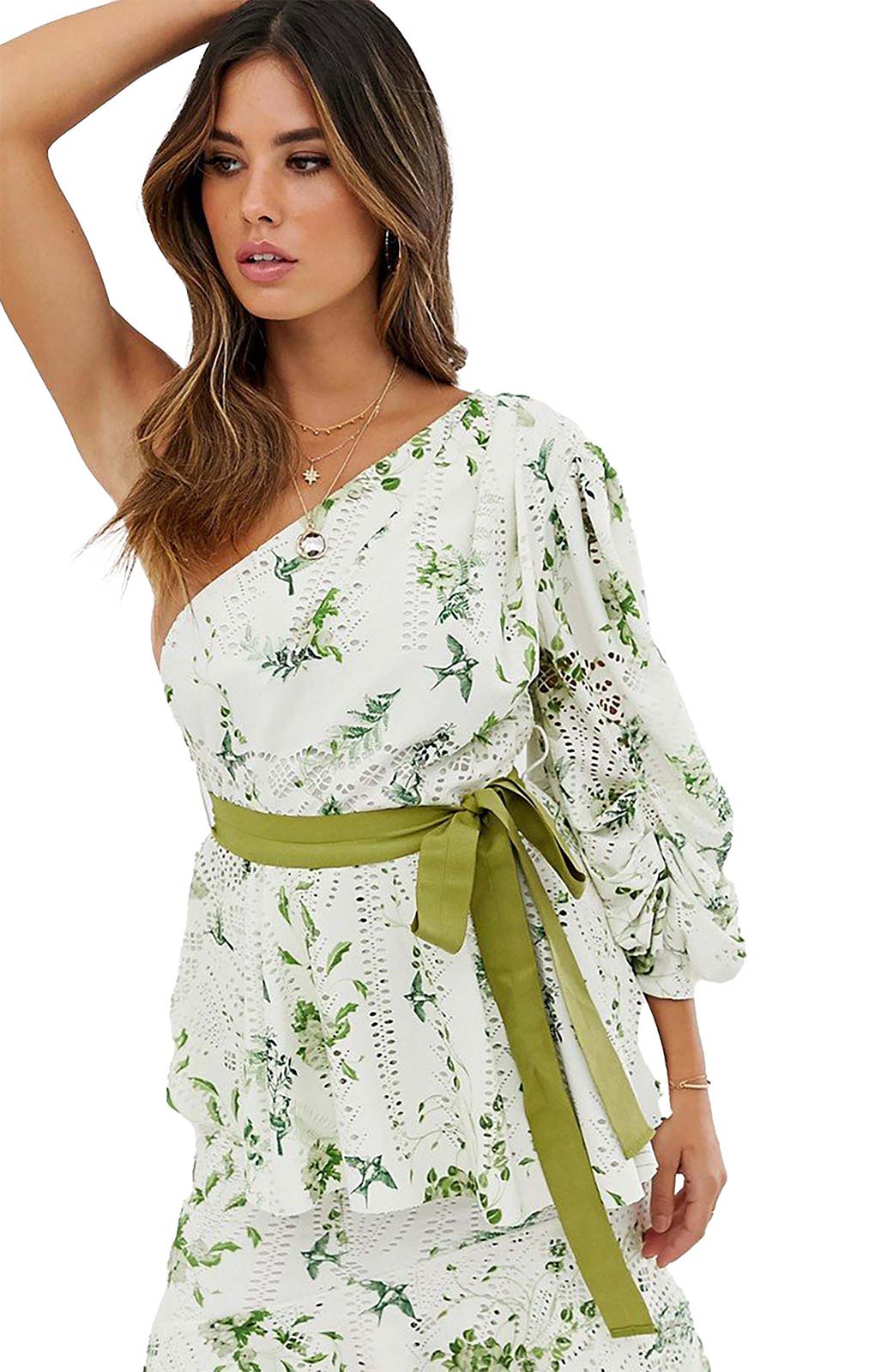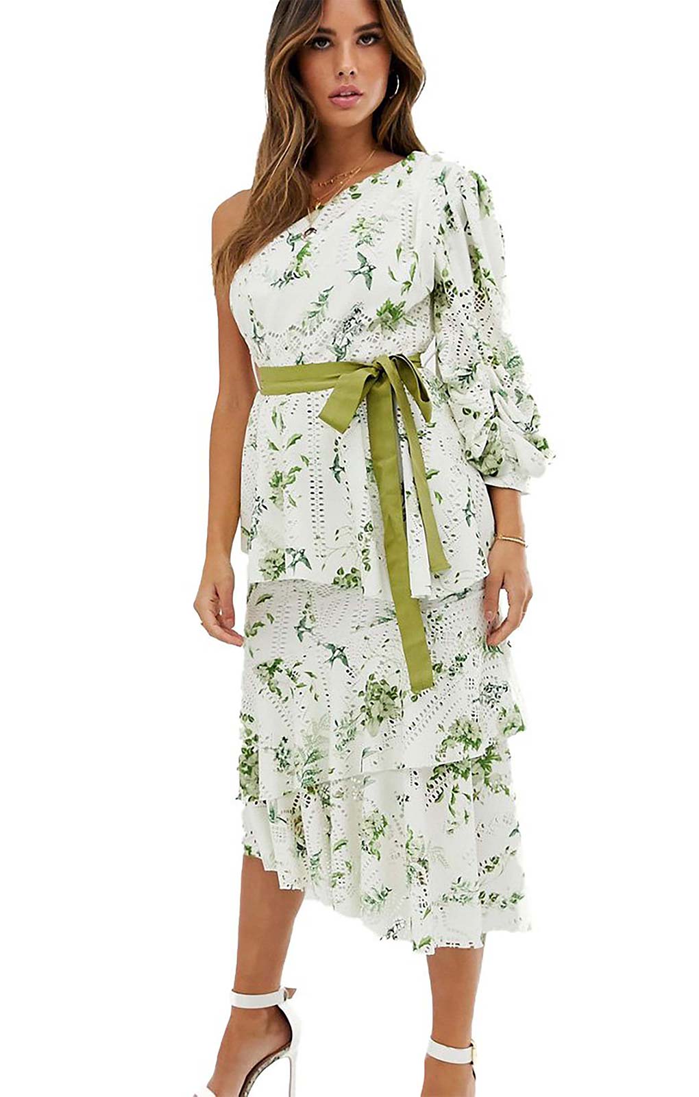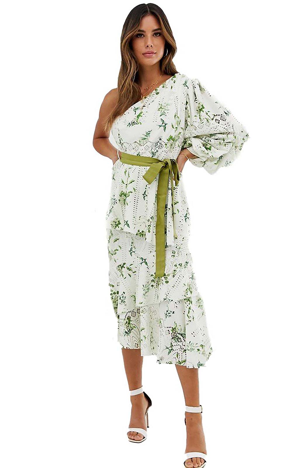 Make a statement with this ASOS DESIGN one shoulder dress, featuring intricate cutwork floral detailing for a feminine, romantic touch. The one-shoulder silhouette adds modern elegance—perfect for summer events, garden parties, or special occasions.