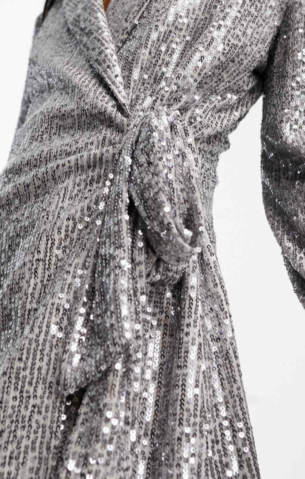 ASOS DESIGN Petite Jersey Sequin Tie Waist Blazer In Gunmetal for power dressing 101. Features: