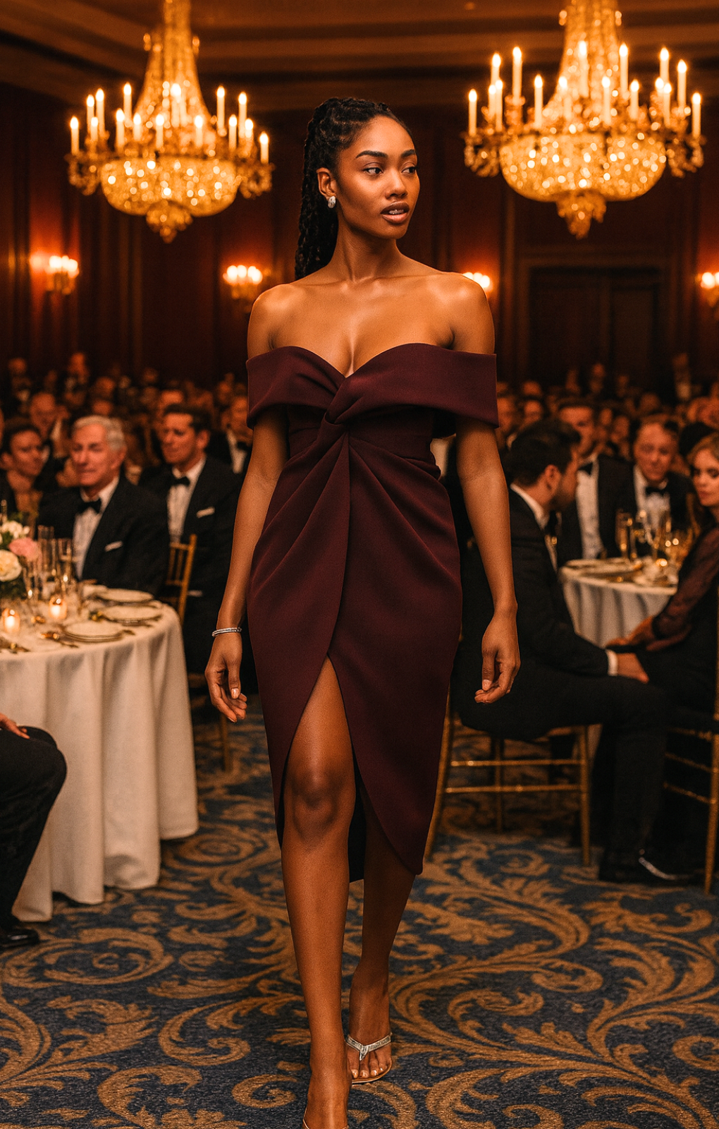 The perfect Autumn occasion outfit is here. Step into style with this ASOS DESIGN Twist Front Off The Shoulder Midi Dress In Aubergine.