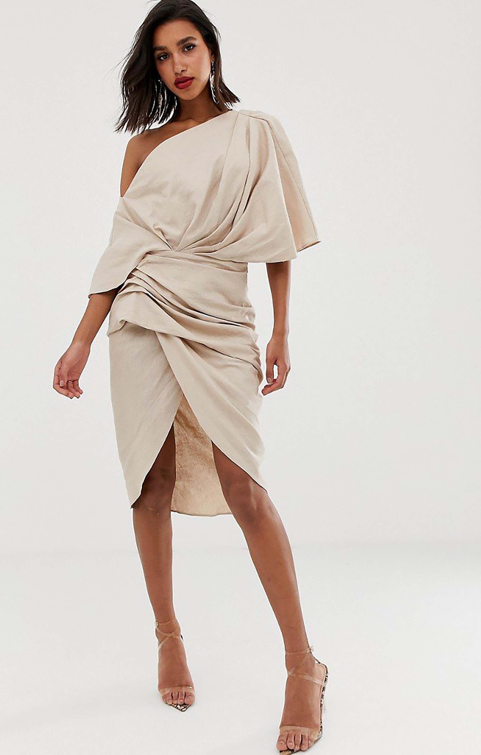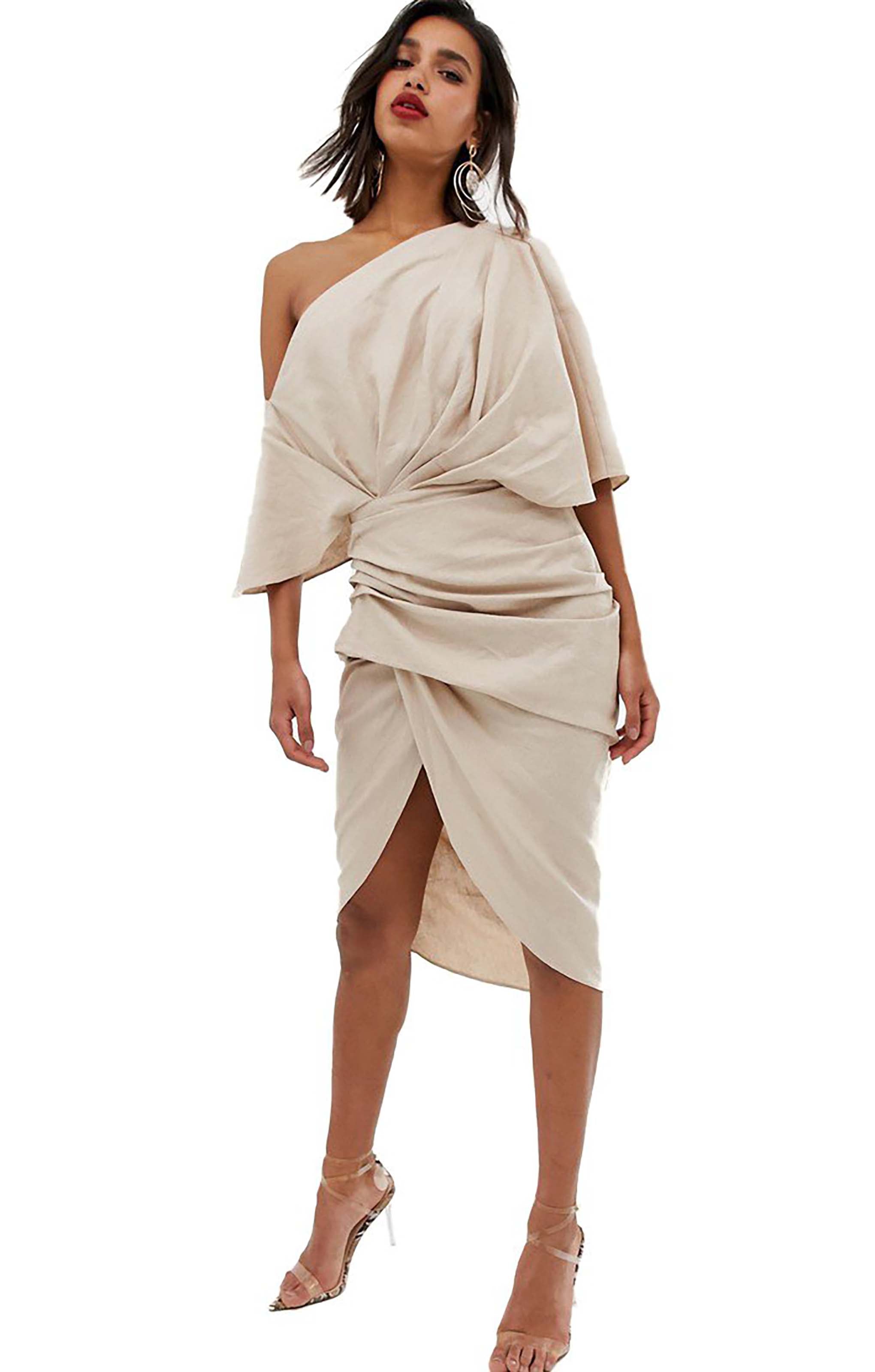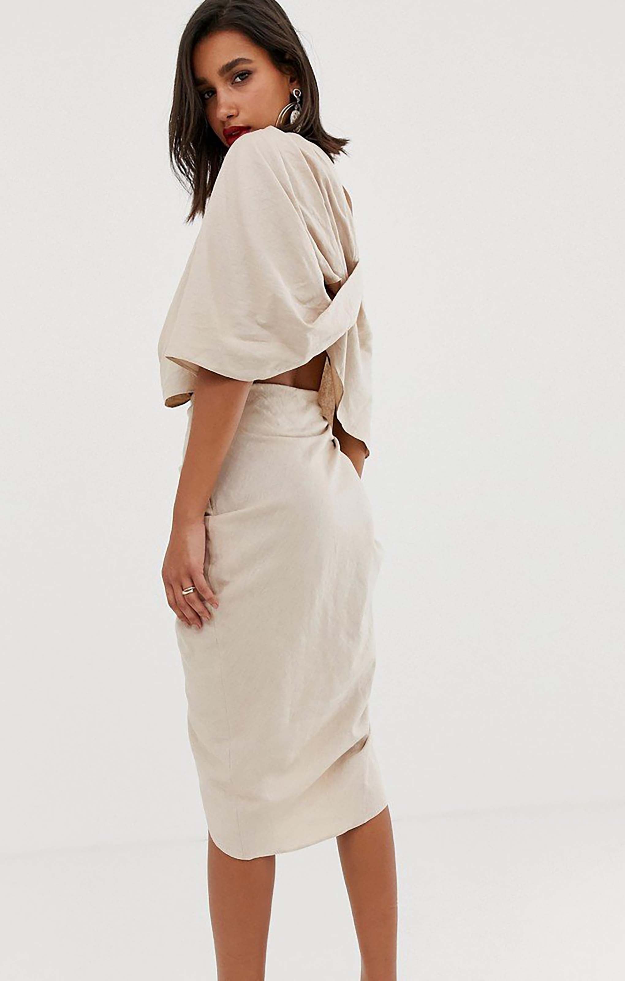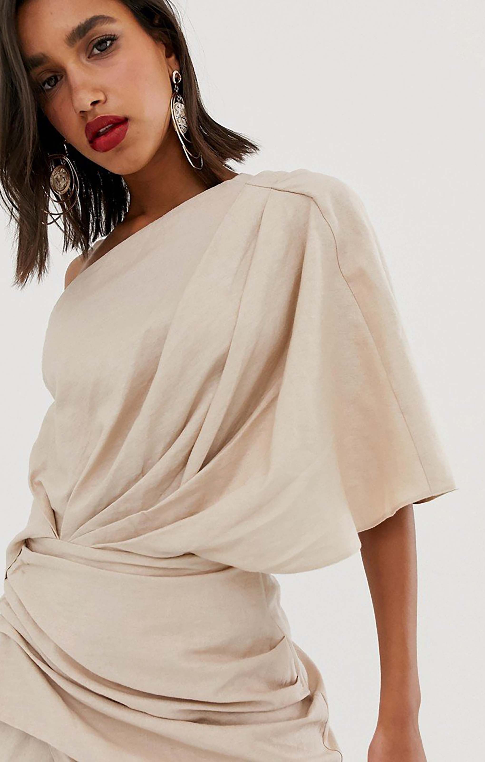 Modern and effortlessly chic, this ASOS EDITION midi dress features a draped asymmetric design in breathable linen. Perfect for daytime events, garden parties, or weddings, it combines relaxed elegance with contemporary style.