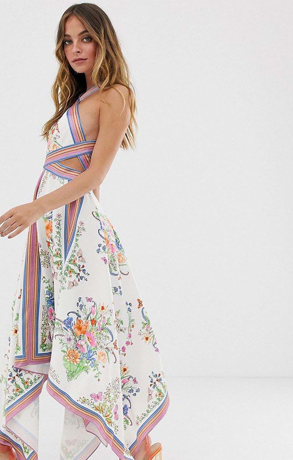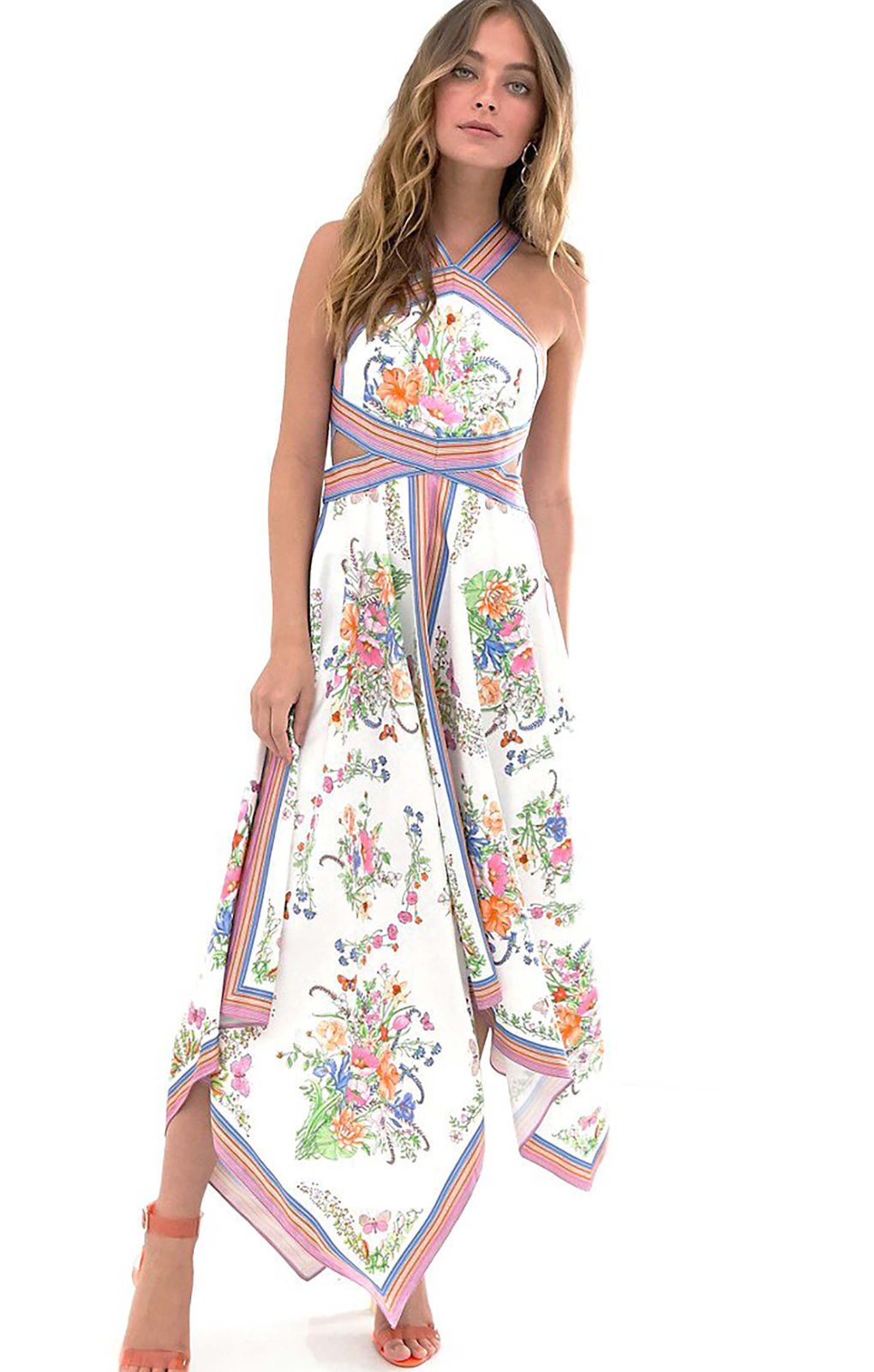 A playful statement midi dress in a bold scarf‑inspired print, featuring a halter neckline and tie‑detail to accentuate the back. Perfect for summer evenings, holiday wardrobes or event dressing with an edge.
