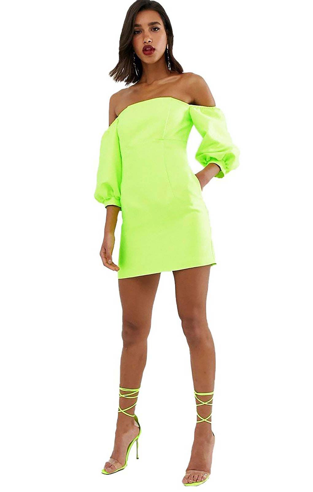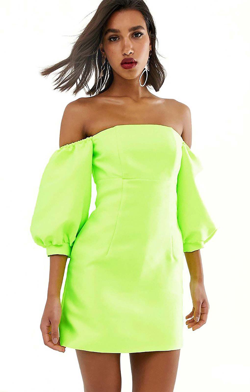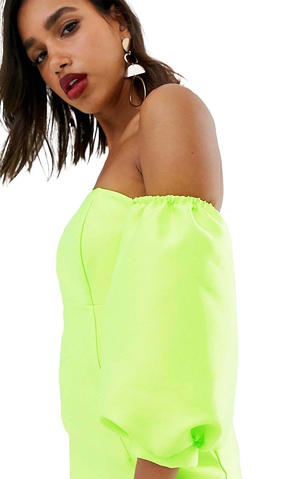 ASOS EDITION Puff Sleeve Off Shoulder Mini in Lime