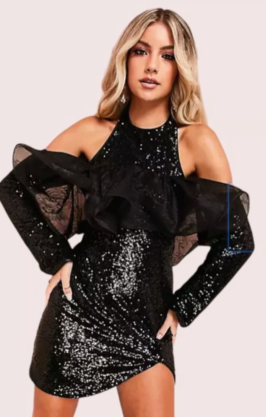 Discover this look ASOS Luxe Halterneck Wire Lace Organza Shoulder Mini Dress In Black Sequin for a statement party look... a round of applause for the dress. Features: