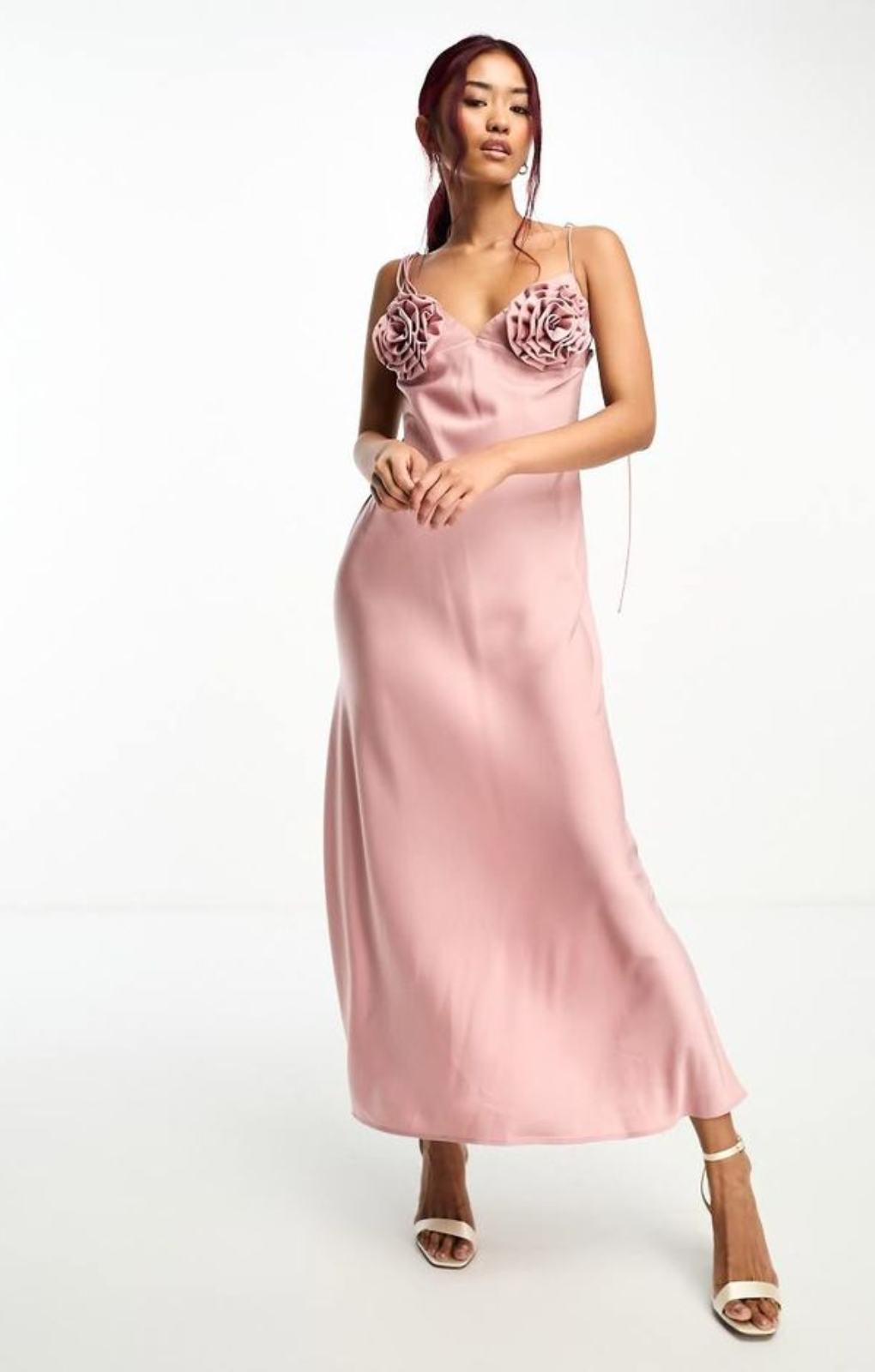 The fabric rose detail at the bust means this is such a stand out style. The bias cut means it fits really well and the ties at the back can be adjusted