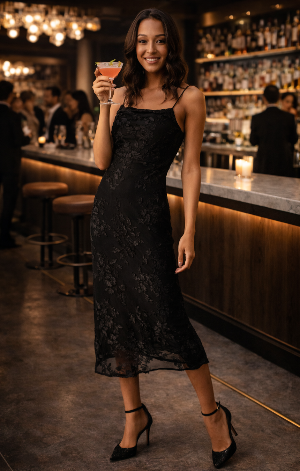You can always rely on a little black dress for a party occasion. This cami midi dress provides sophistication and elegancy. Team with a red lip and silver heels and accessories.Features: Spaghetti strap Sleeveless Zip back fastening Tie up waist