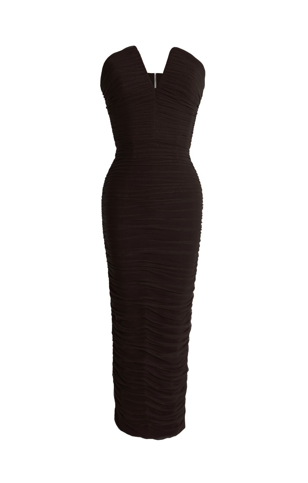 Expertly crafted with ruched detailing and a flattering V-neckline, the Ferra Dress is a sophisticated choice for any occasion. Designed in a feminine tea length, this bodycon dress accentuates your curves for a confident and stylish look. Perfect for making a statement at your next event.