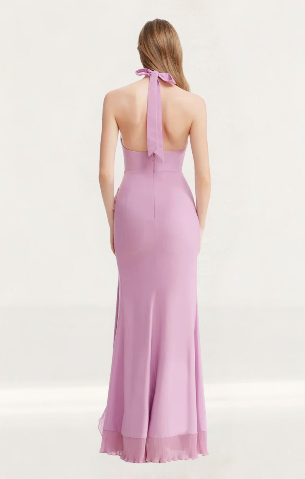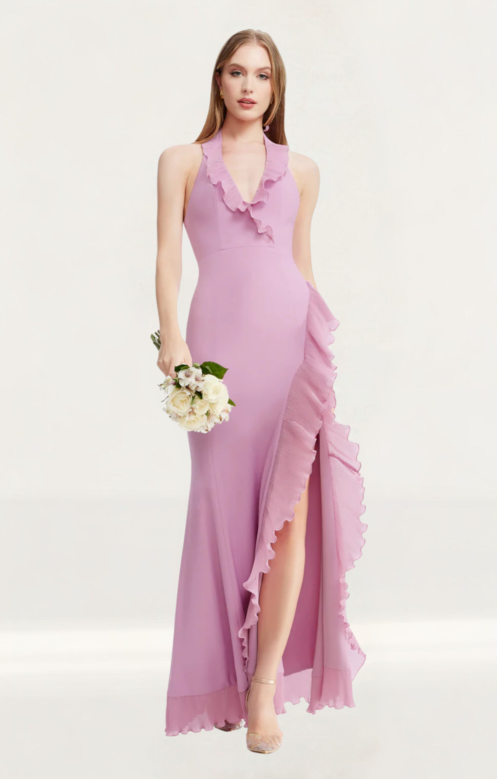 Discover elegance with the Kathleen Dress. This halter gown features a stunning ruffle detail and an asymmetrical mermaid silhouette. Perfect for any special occasion, this dress will make you feel confident and stylish. Elevate your look with this timeless and flattering design.