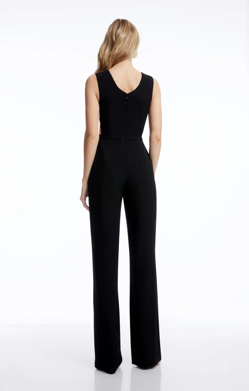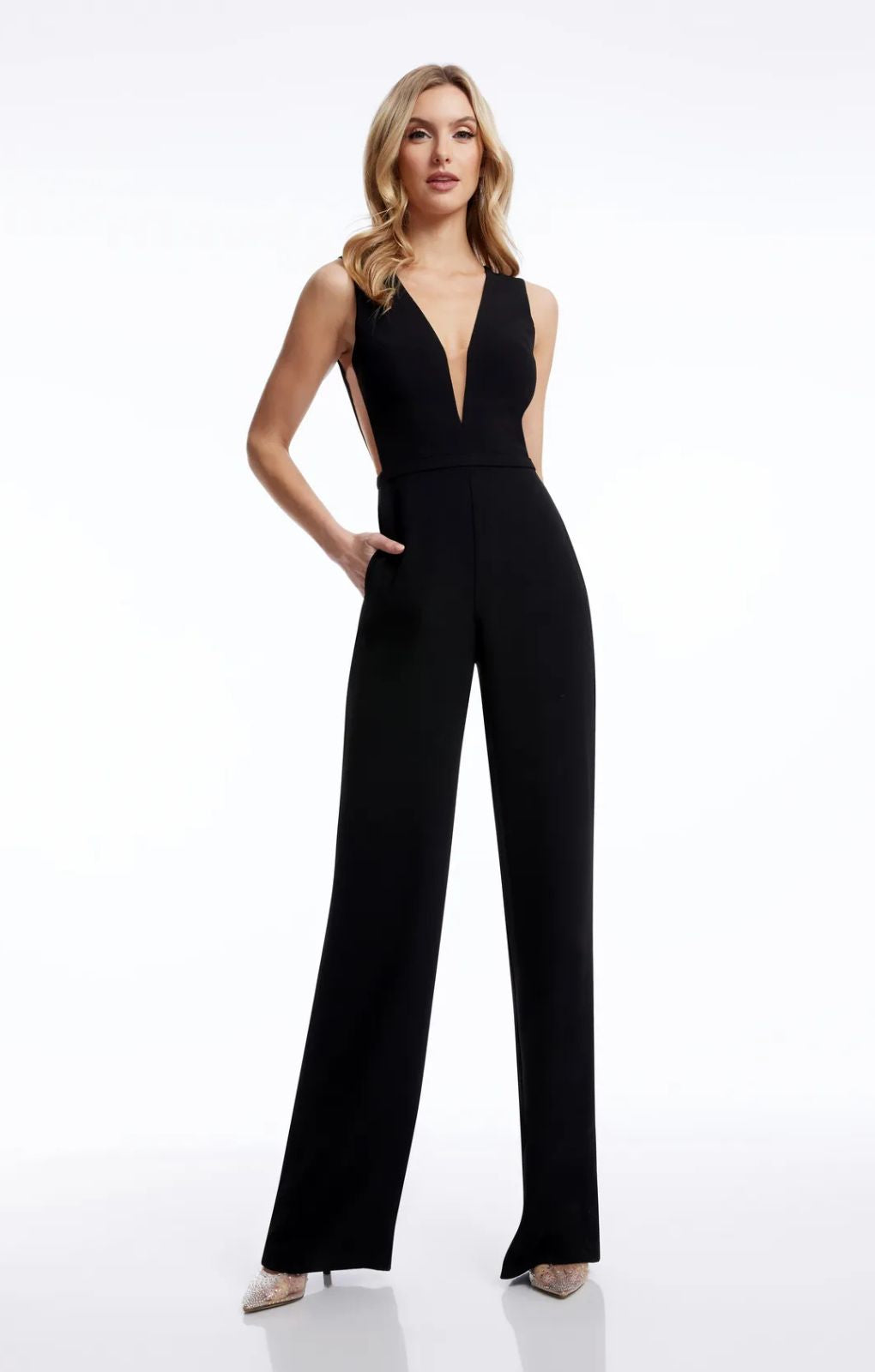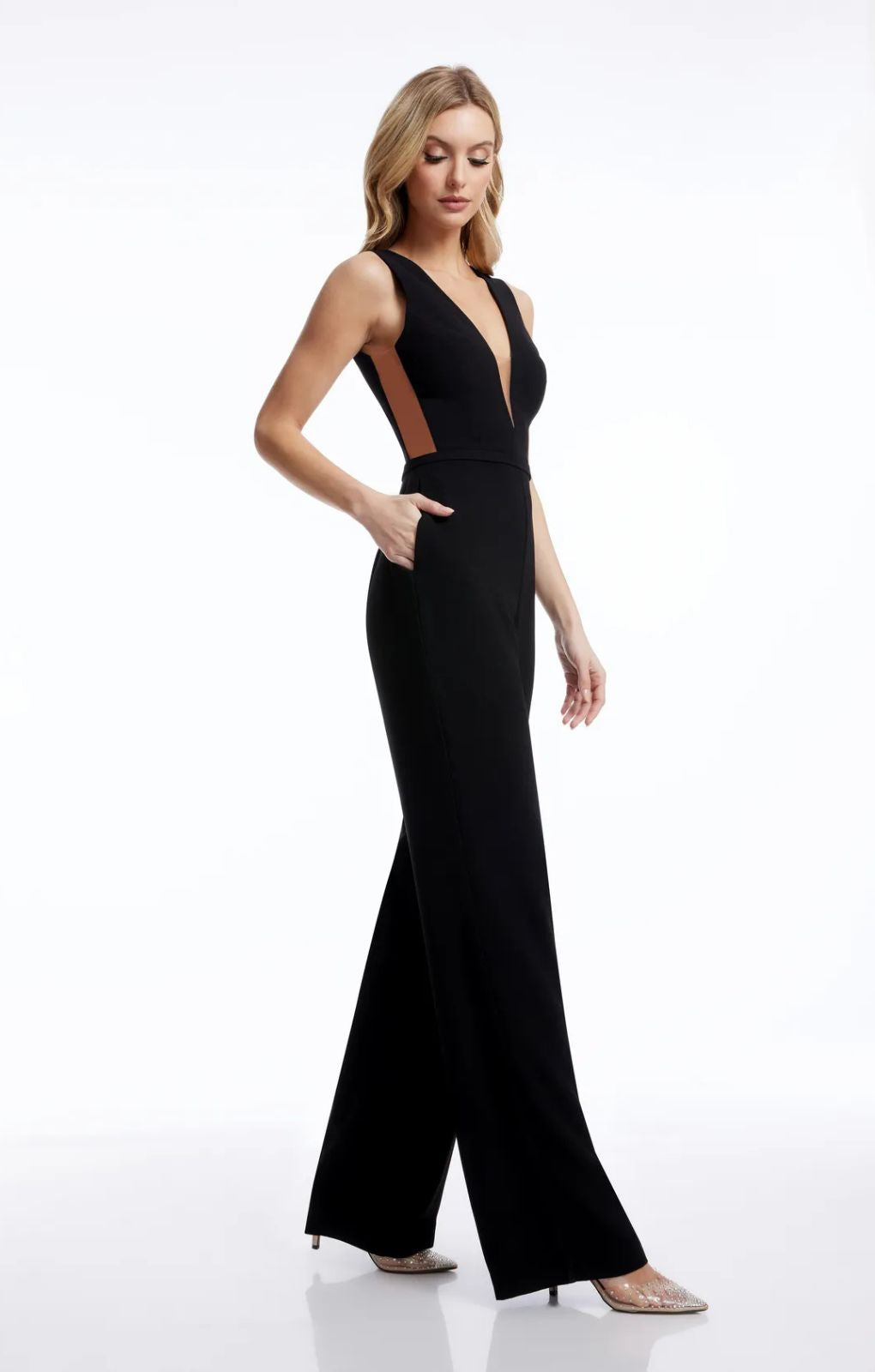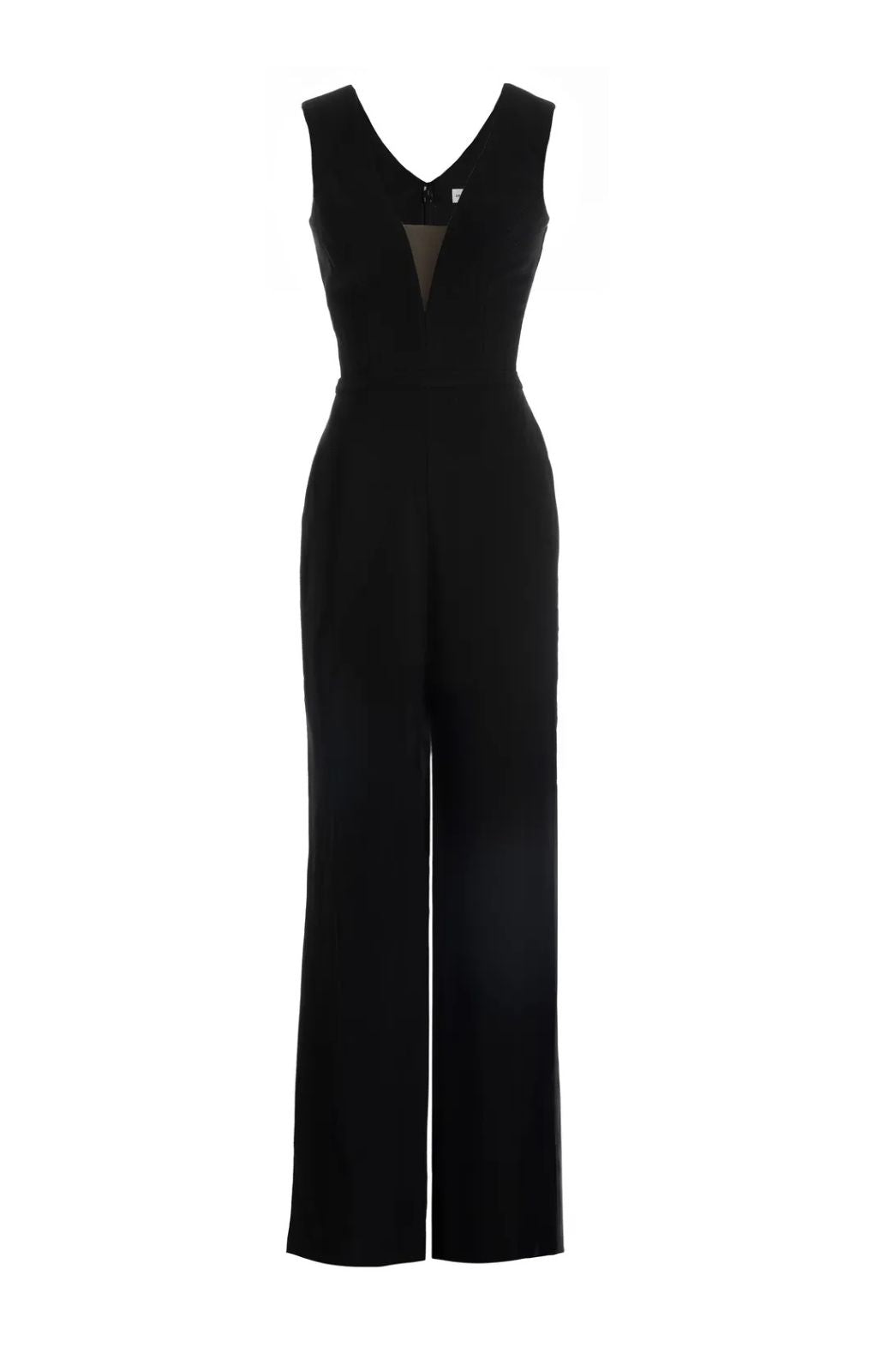 The Katrina Jumpsuit is a chic and modern piece featuring a sleeveless design and a daring deep V-neckline. Its wide-leg silhouette exudes effortless elegance, while the side mesh inserts add a touch of edgy sophistication.