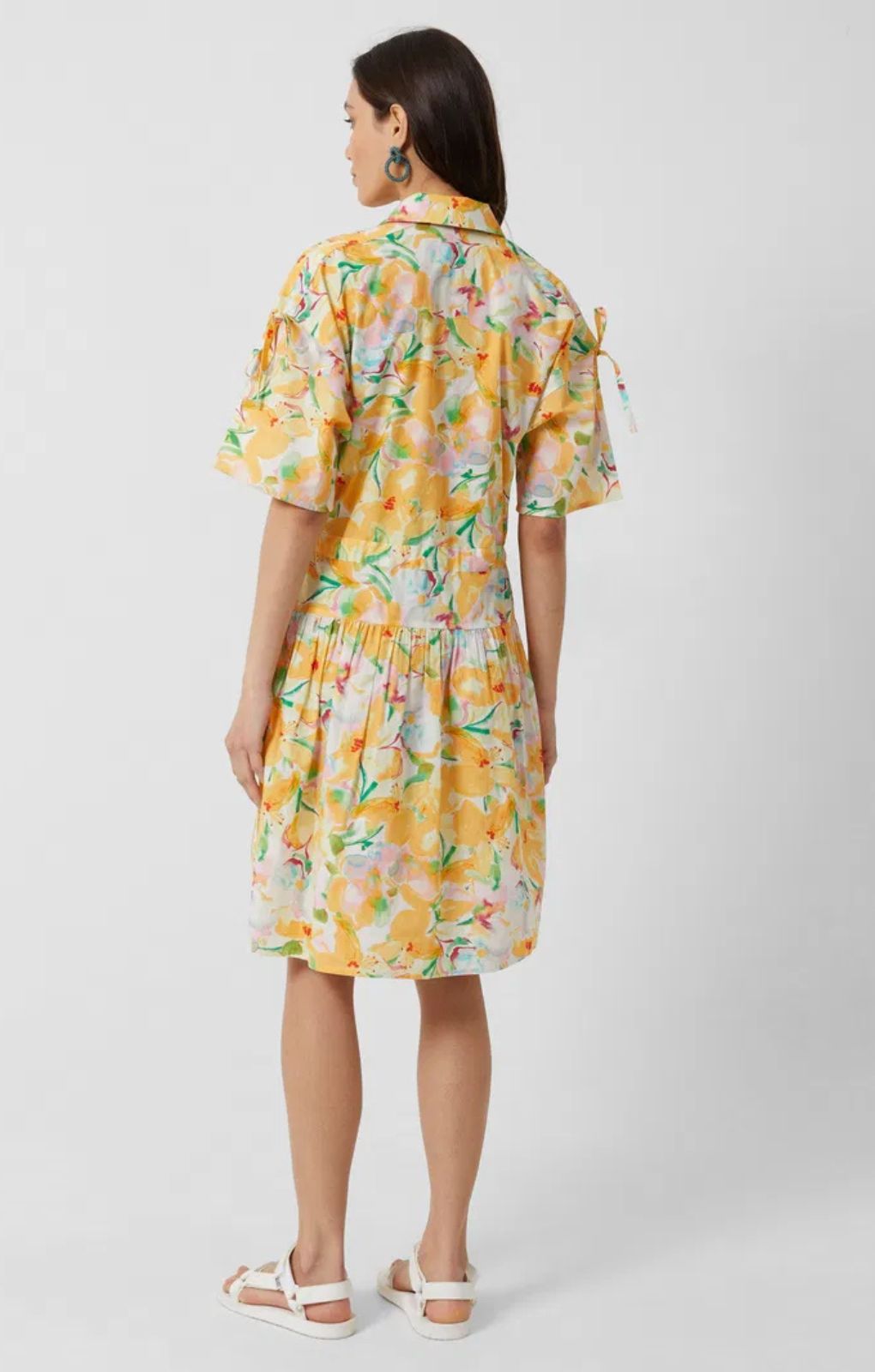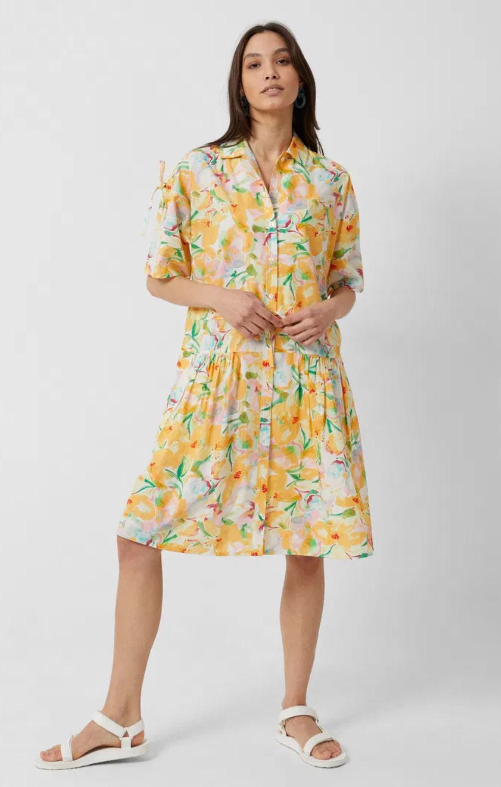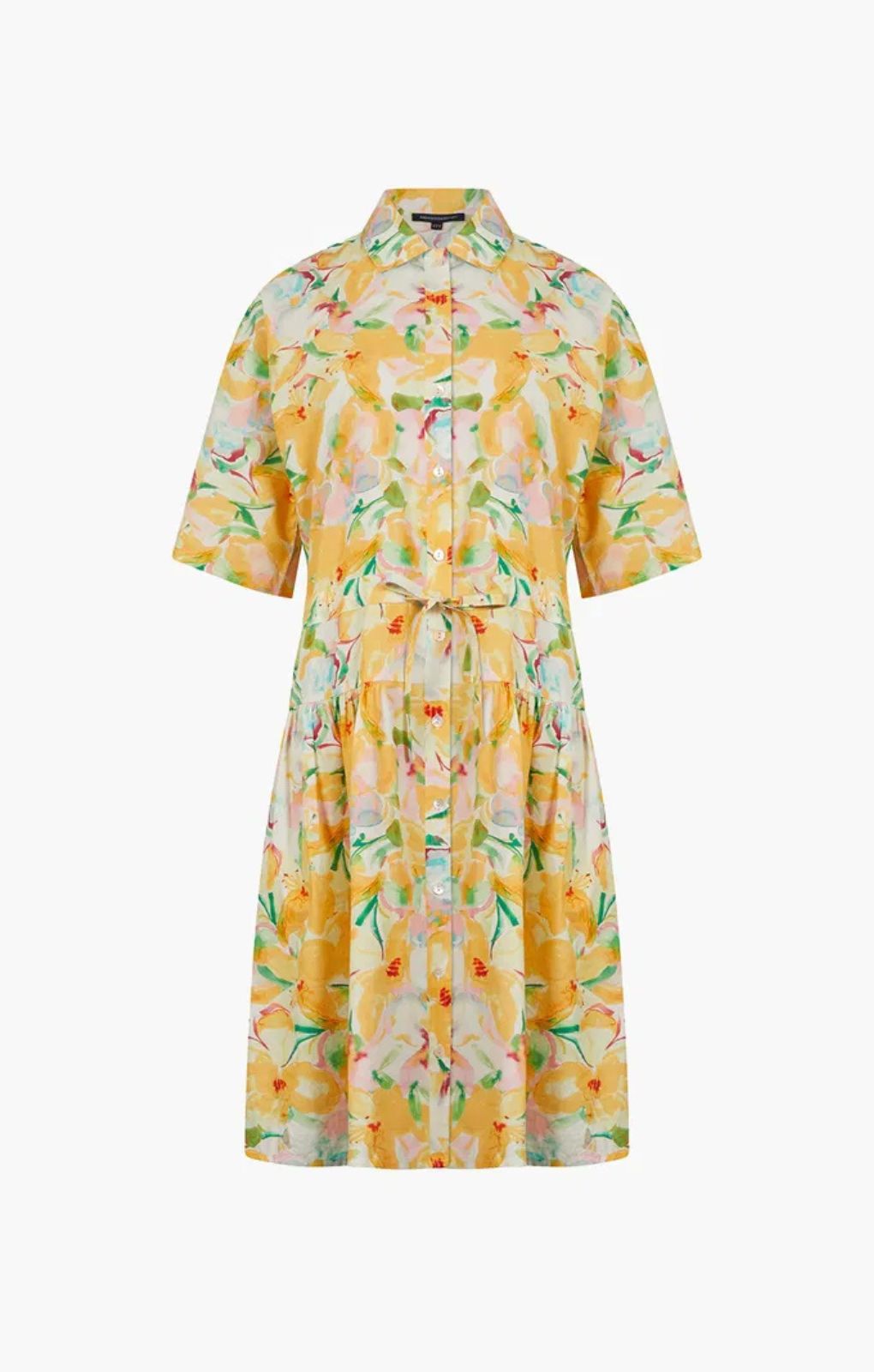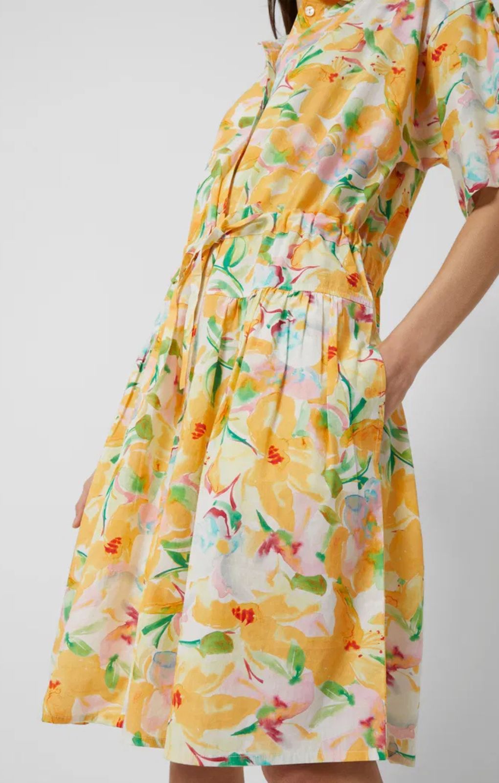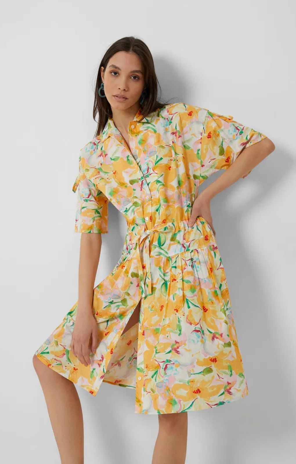 Flaunting a bright floral pattern, this cotton style is fashioned with a collar, two side pockets, drawstring waist and a button-down front with optional split leg styling.
