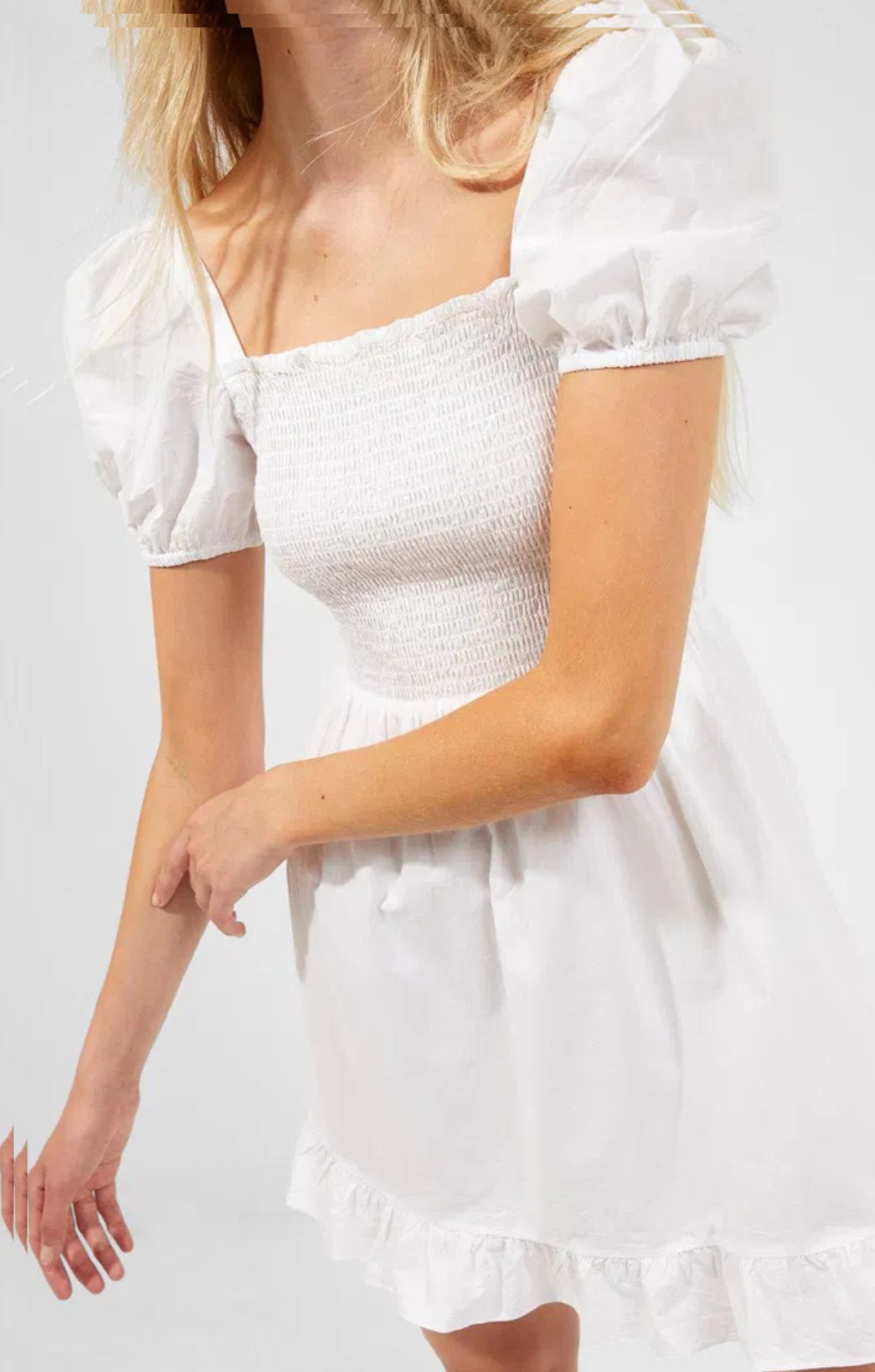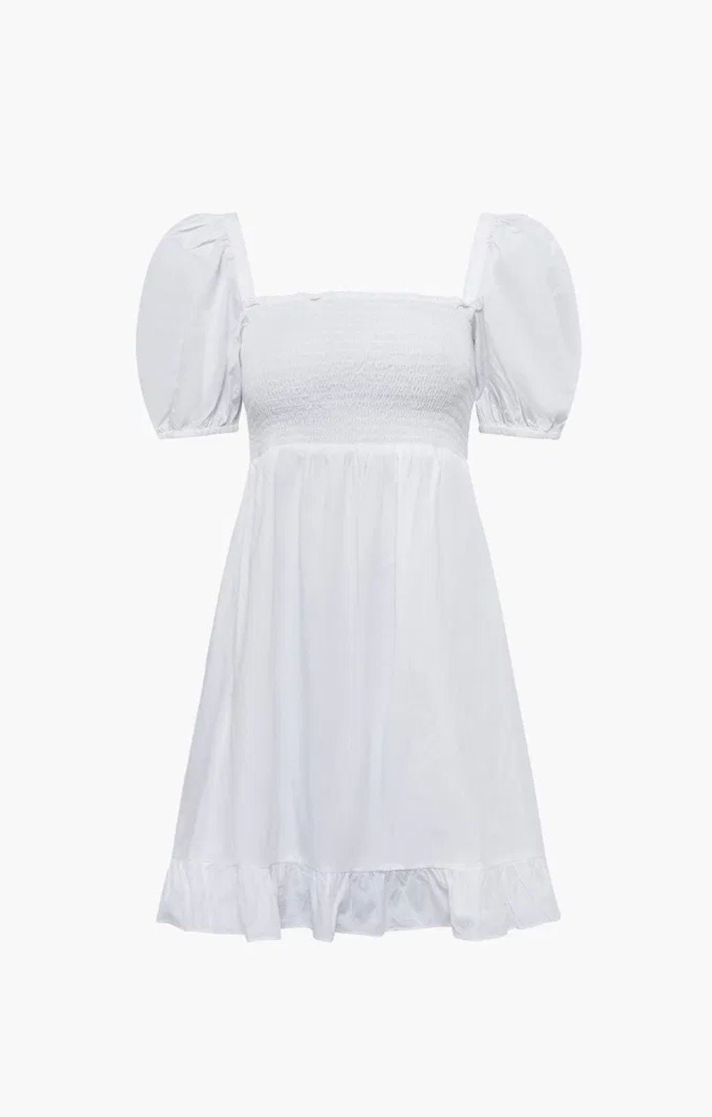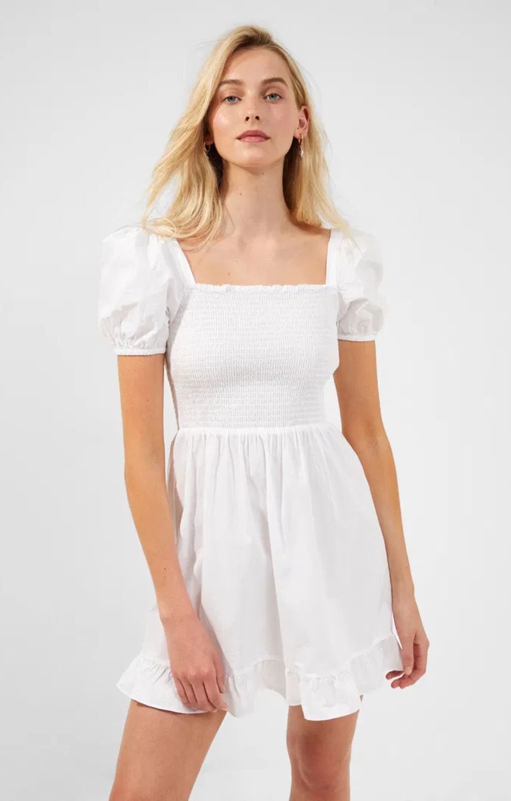 French Connection Armina Organic White Poplin Mini Dress Sure to become a wardrobe favourite - the Armina Organic Poplin Mini Dress. Designed with a square neckline, puffed-up sleeves and smocked bodice.