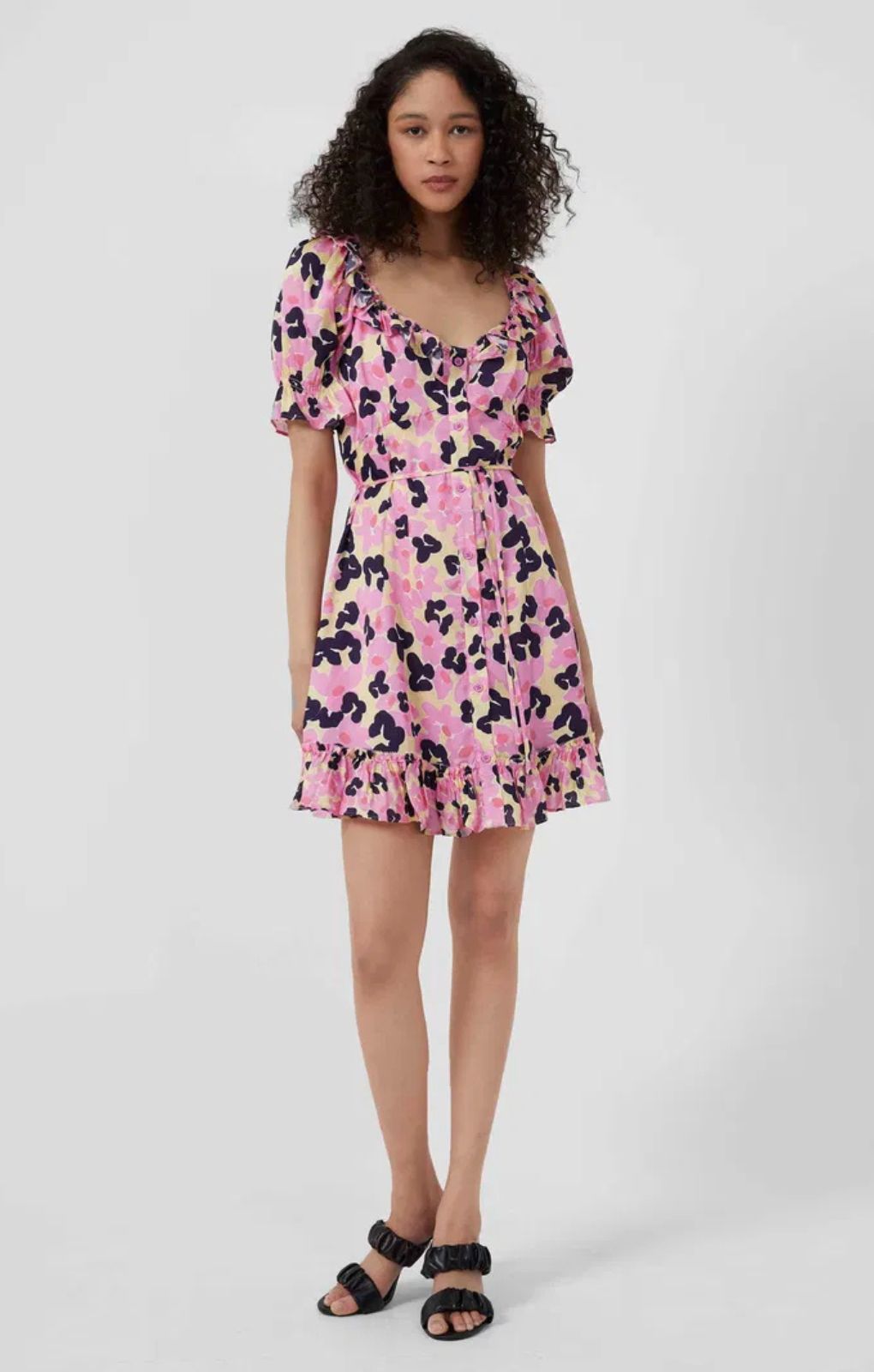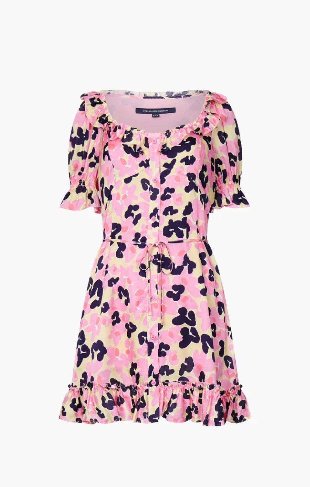French Connection Cassia Elitan Shirt Mini Tea DressShake up your florals with the Cassia Elitan Shirt Tea Dress. Falling to a mini length, it’s framed with fun ruffles and has a button-front fastening.