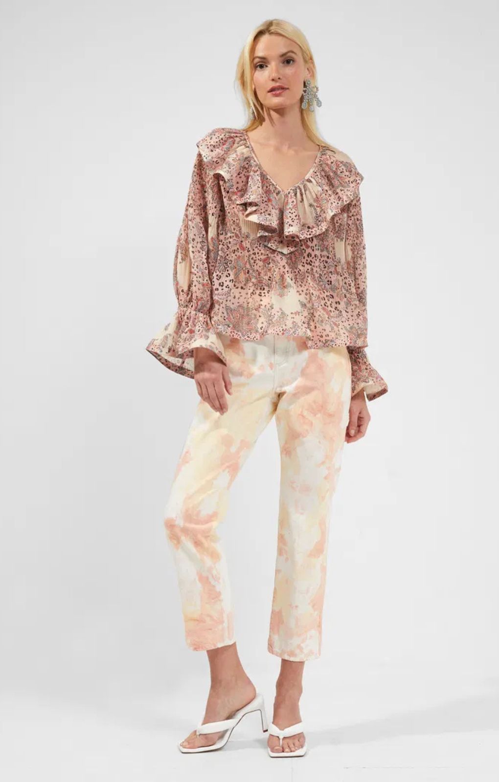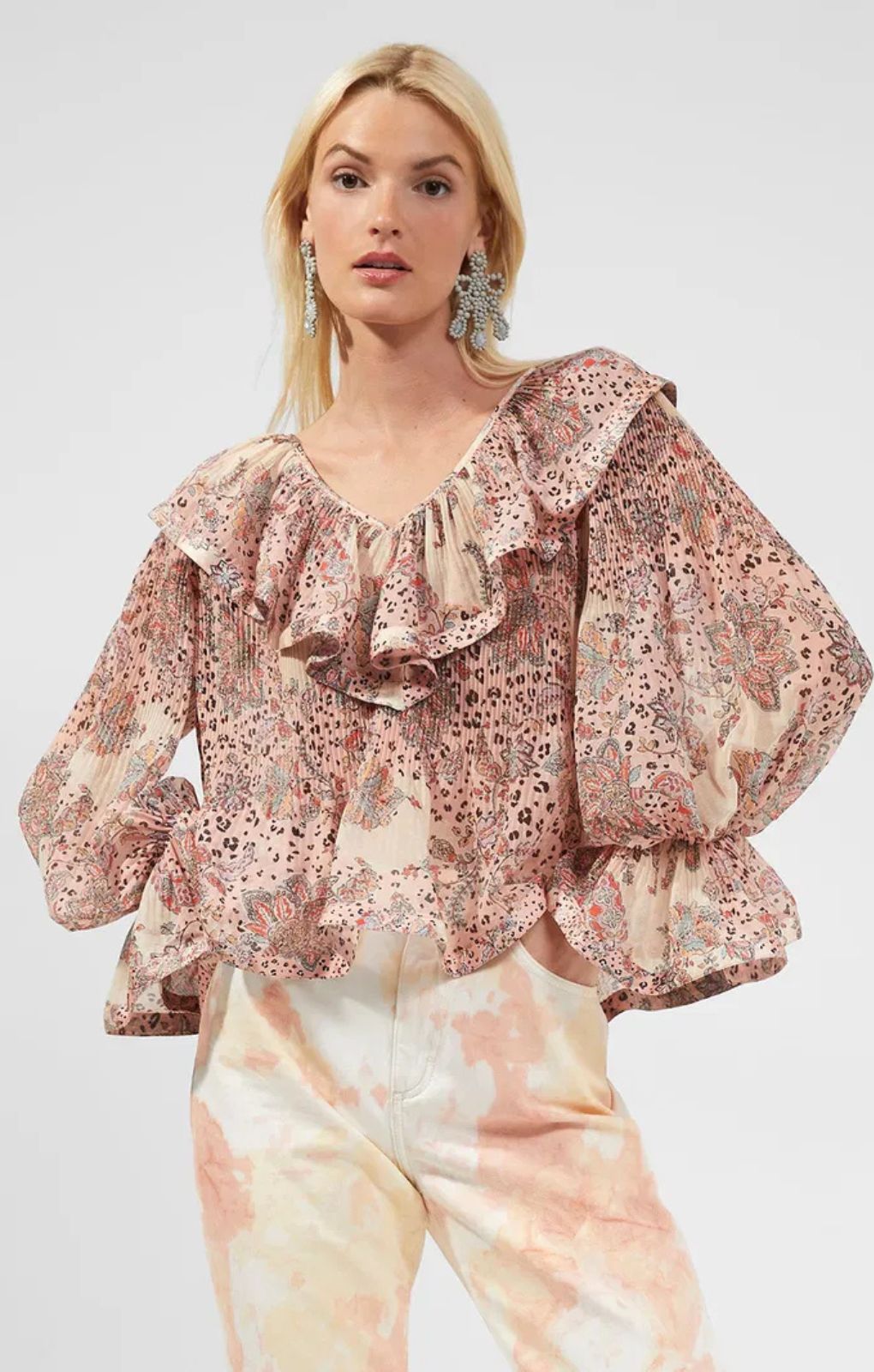 Can you feel the big energy? The Demetra Recycled Gathered V-Neck Frilled Blouse has an airy silhouette with an exaggerated ruffled neckline and sleeves.