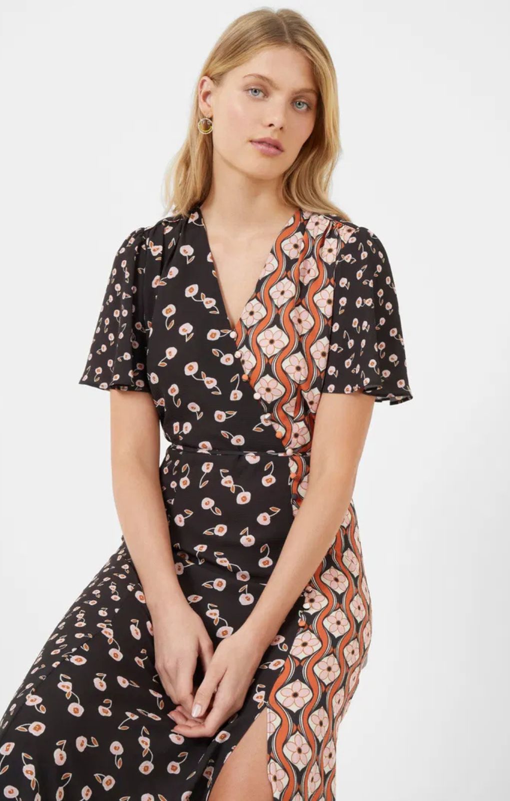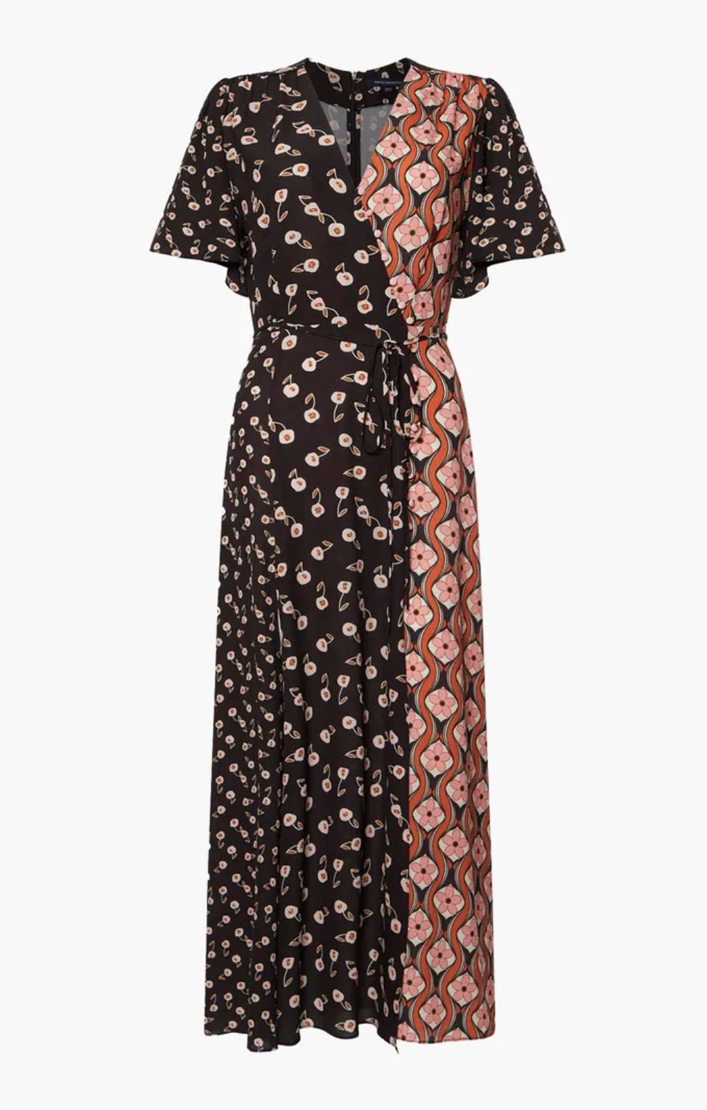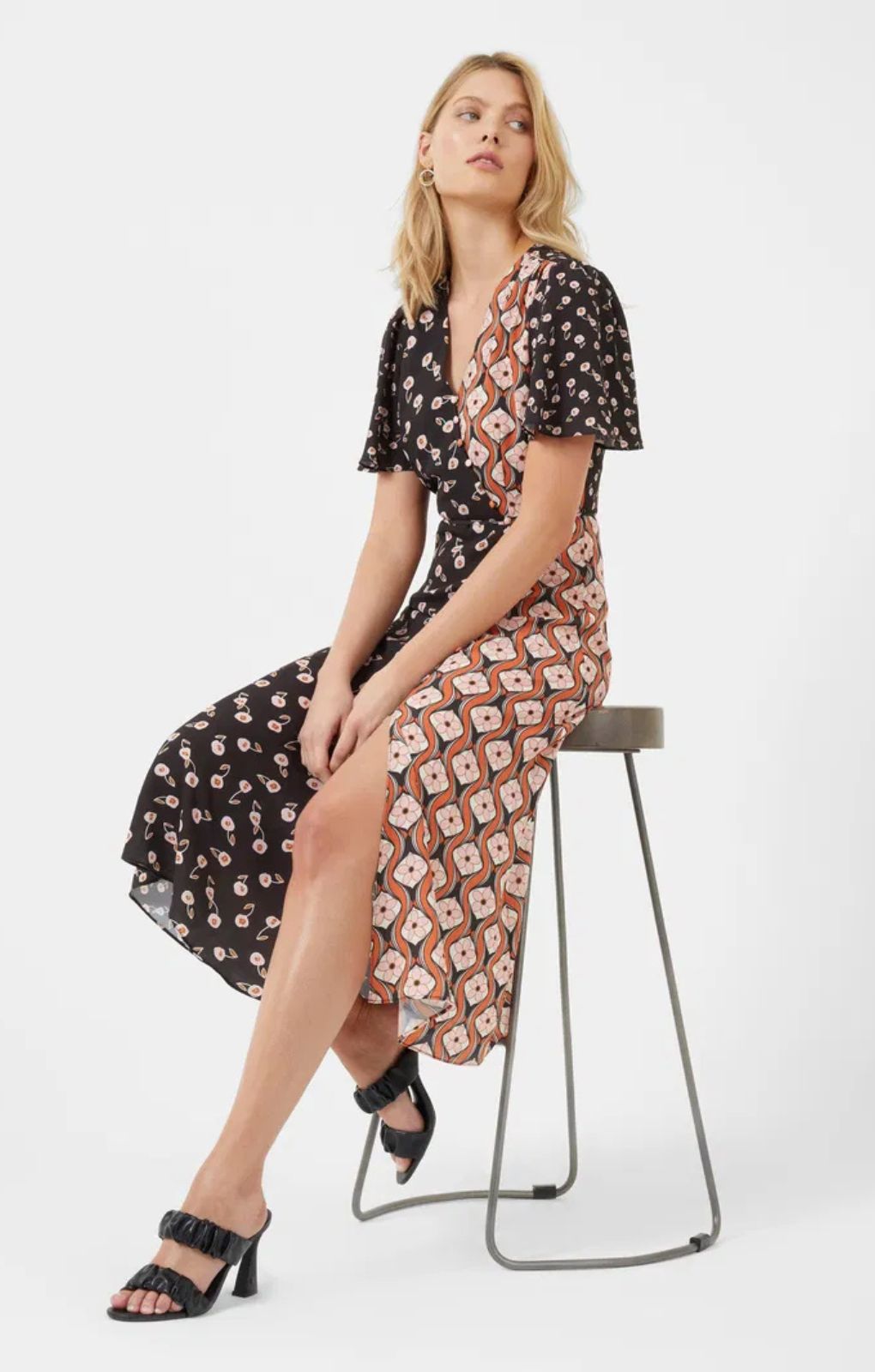 We've turned back time to the trendy '70s with the Francine Recycled Verona Midi Dress. Two contrasting floral prints come together for an asymmetrical nostalgic nod from its v-neckline to its single midi length leg split, all tied together with a matching waist belt and petite button detailing.