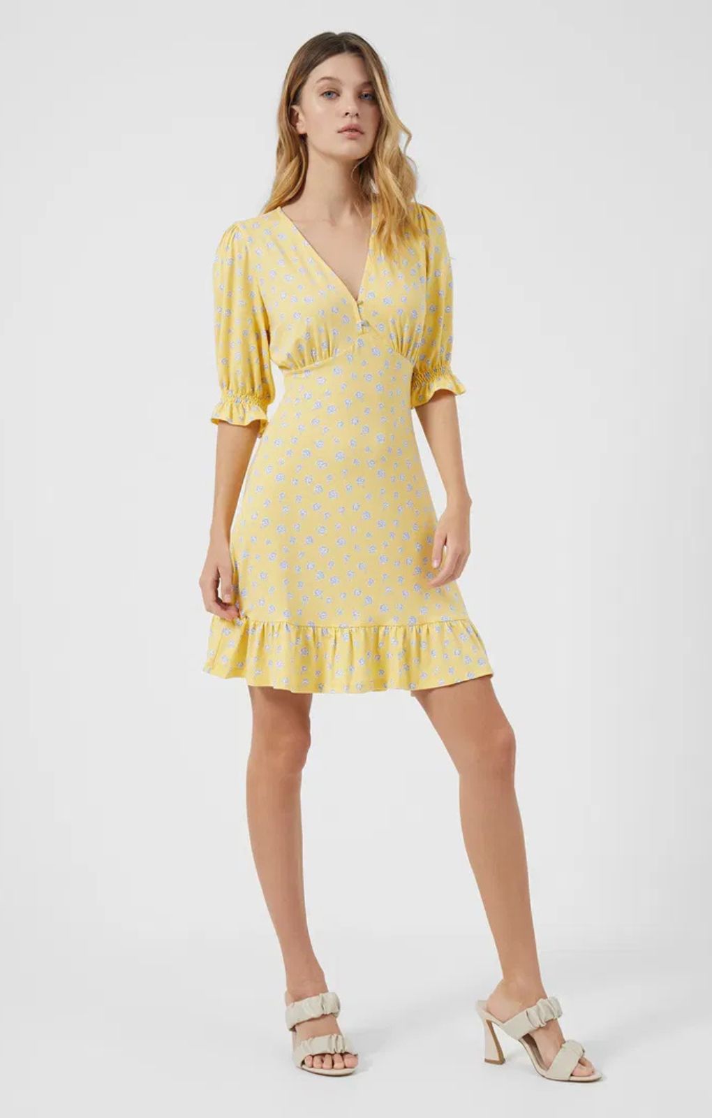 French Connection Peony-Doria Eco Puff-Sleeve DressGo from park to the beer garden in the Peony-Doria Eco Puff-Sleeve Dress. In a lightweight fabric, it has a V-neckline, short sleeves and peplum hem.