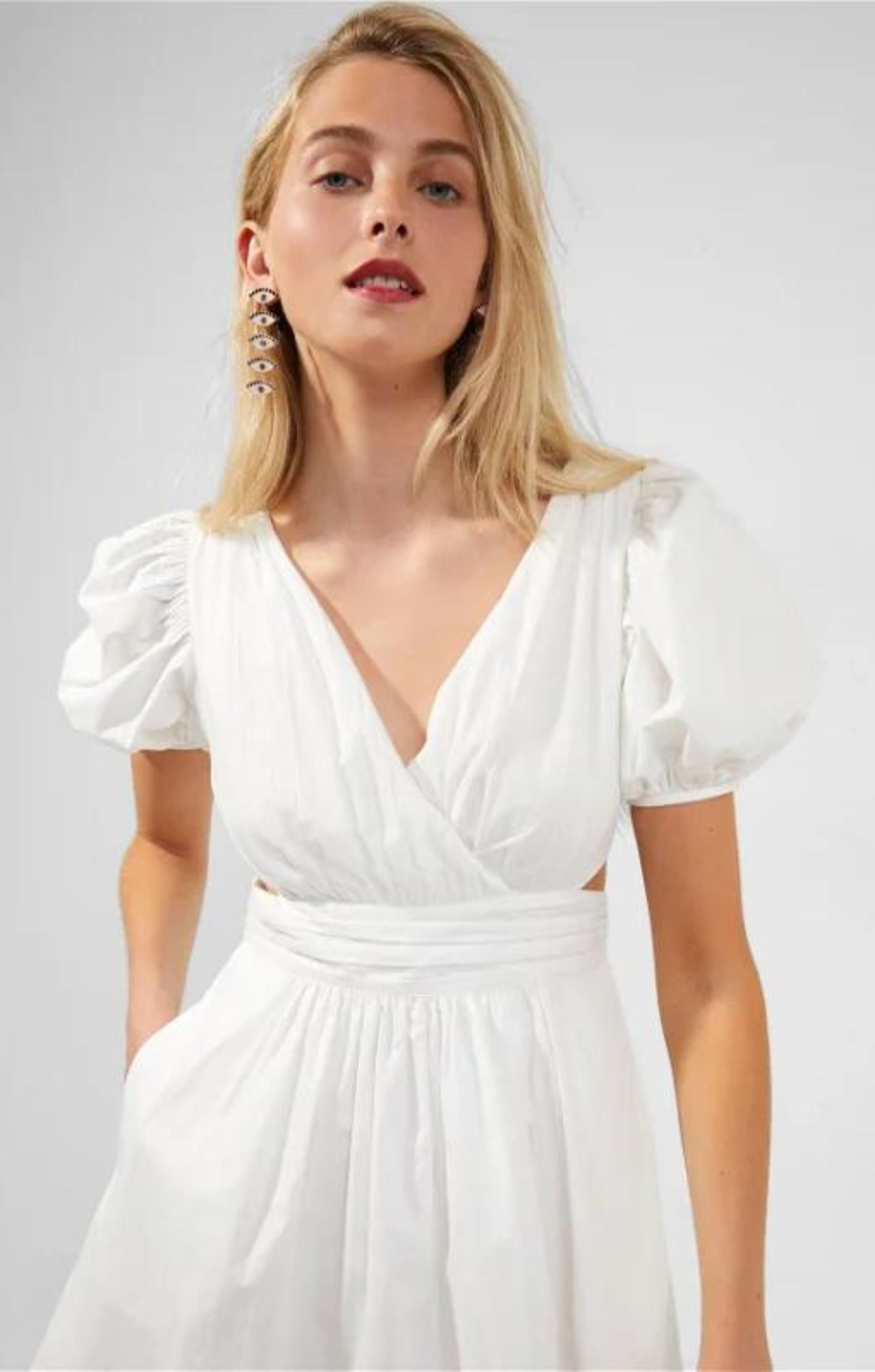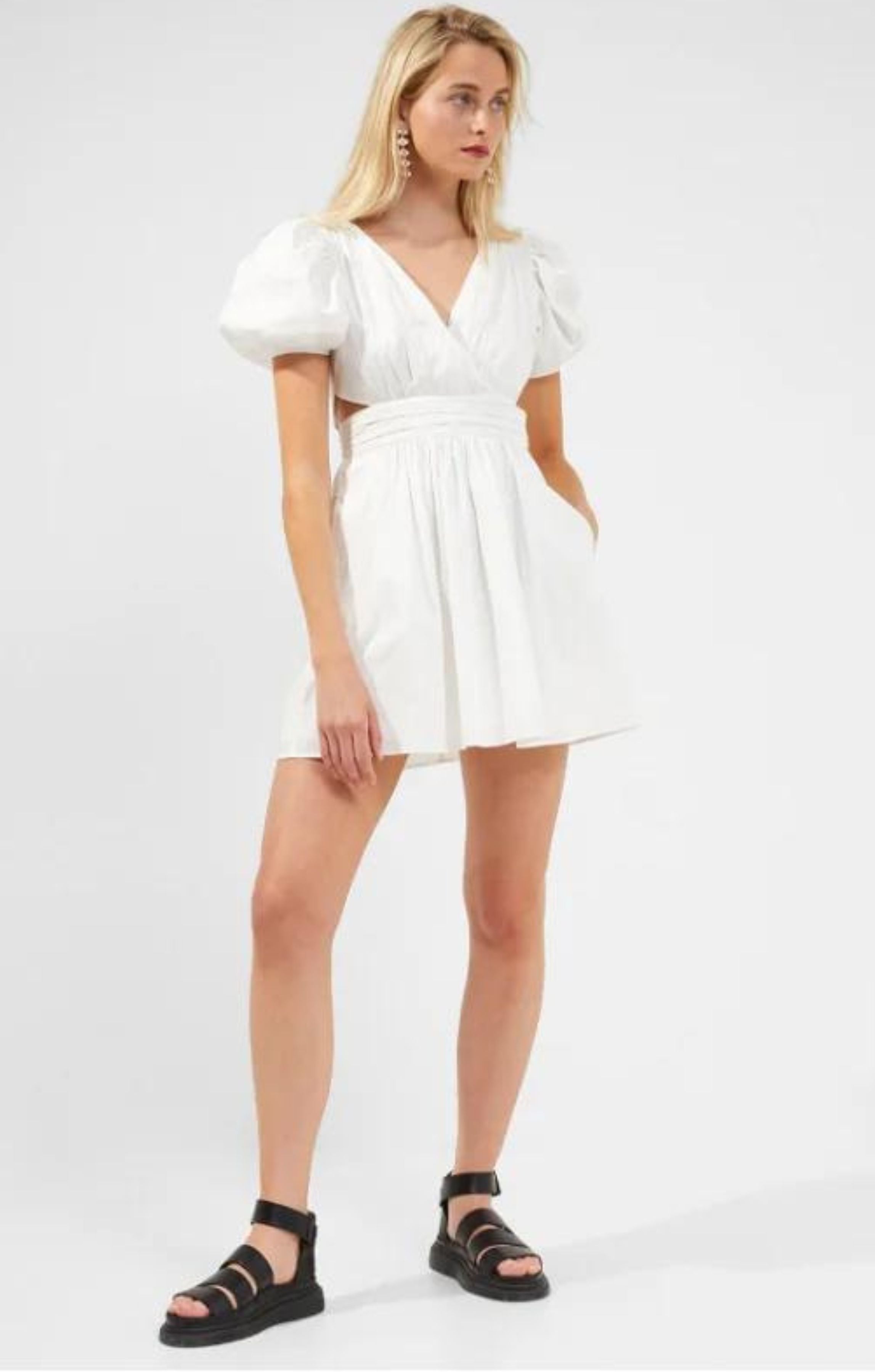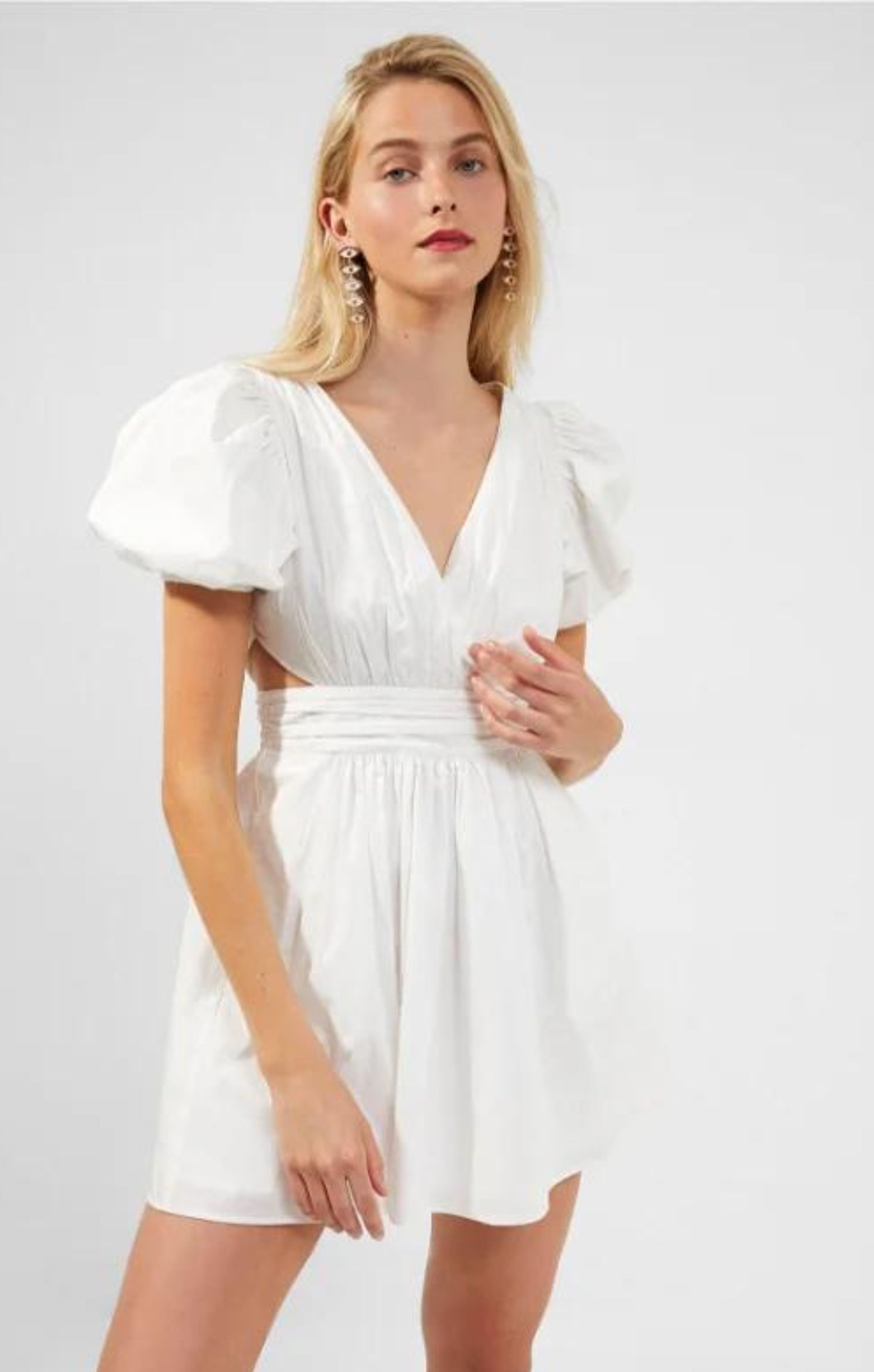 Crafted from cotton to a crisp silhouette, the Rhodes Poplin V-Neck Mini Dress is designed with a V-neckline and short, puffed-up sleeves. The short style also has cut-outs at the sides to show off more skin on spring walks.