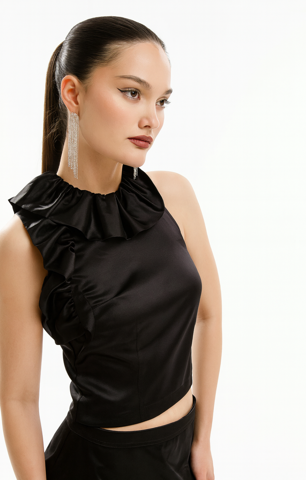 French Connection Satin Top With Ruffle Detail In Black Featuring: