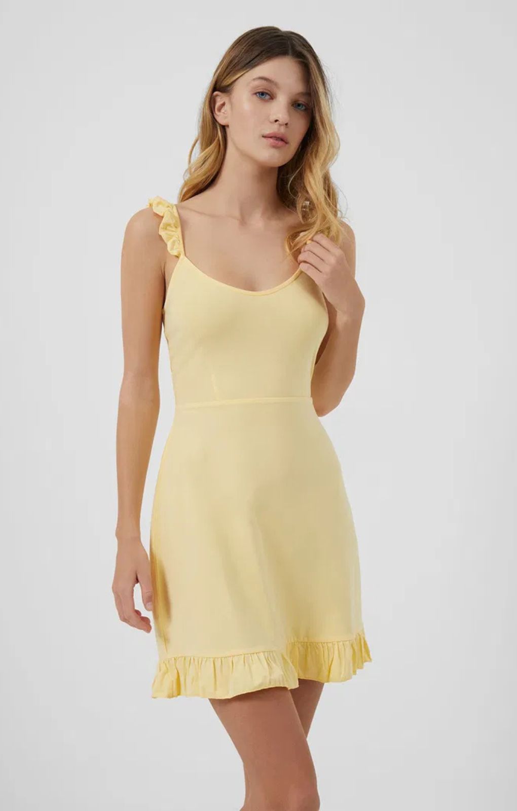 This dress is a ray of sunshine for your summer wardrobe. The romantic sweetheart neckline is paired with playful frill straps, whilst the hem presents ruched detailing. A dreamy dress, with a fitted bodice and relaxed mini skirt.