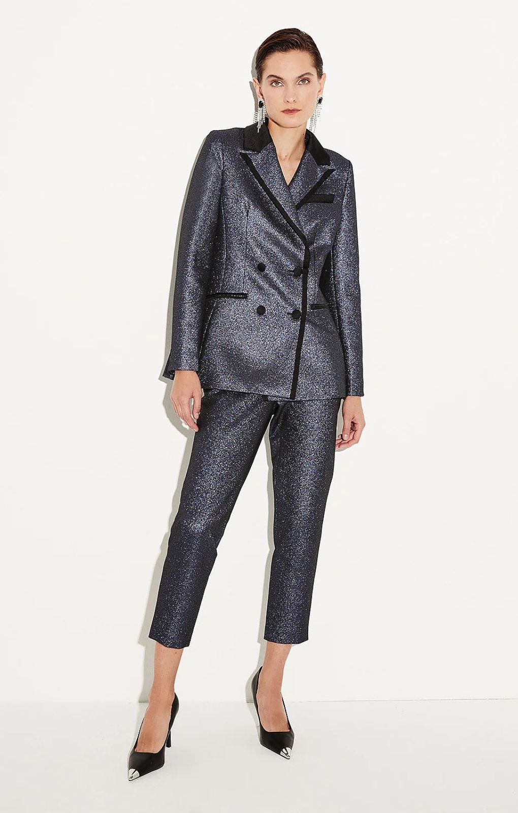 This metallic jacquard blazer jacket marries fine tailoring with the sparkle of partywear. Smooth black satin trims finish the look. Notch lapels Long sleeves Welt pockets Button fastenings through double-breasted front Main: 77% Polyester, 23% Metallised Fibre. Excluding trims: Lining: 100% Polyester.