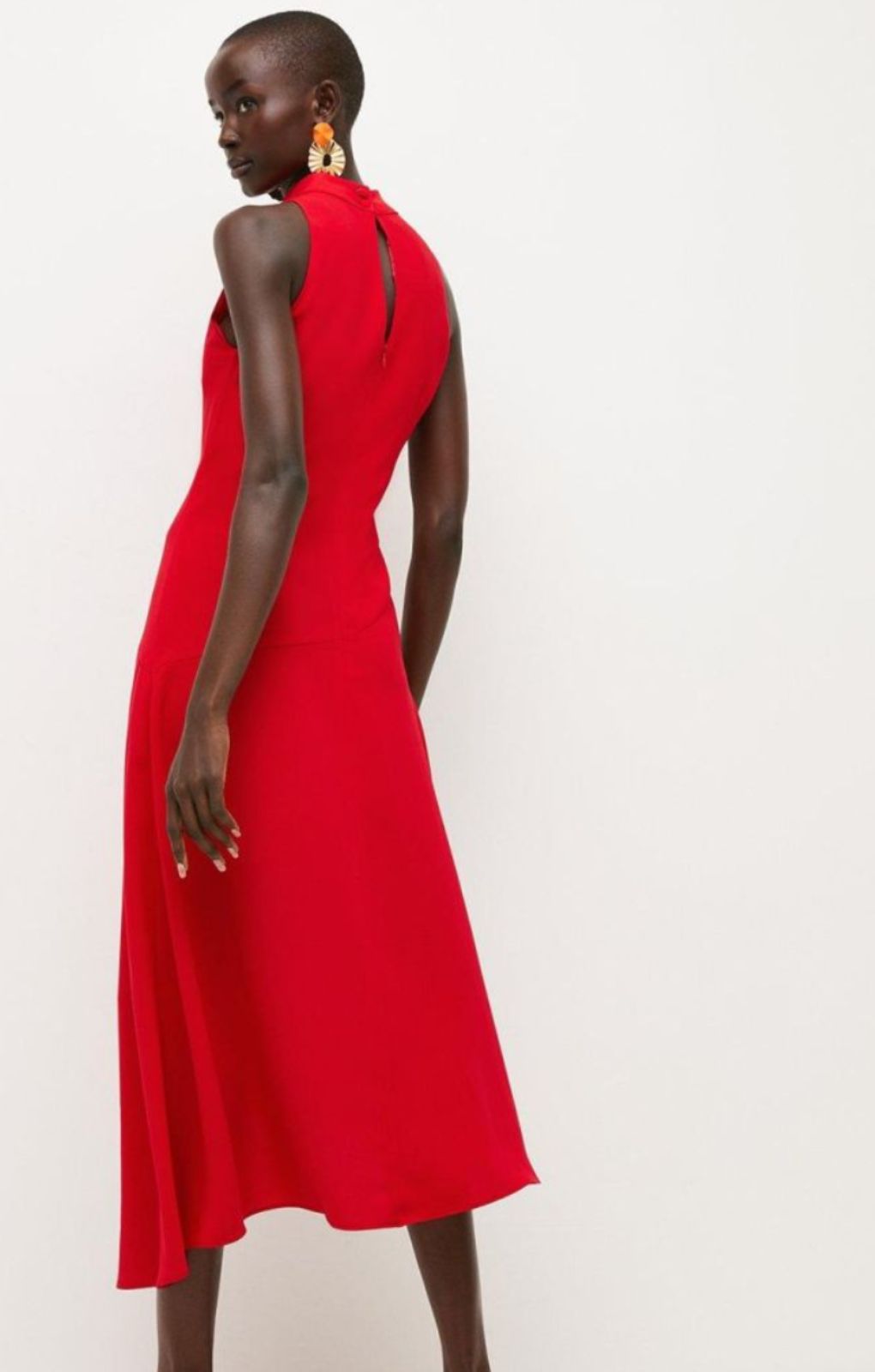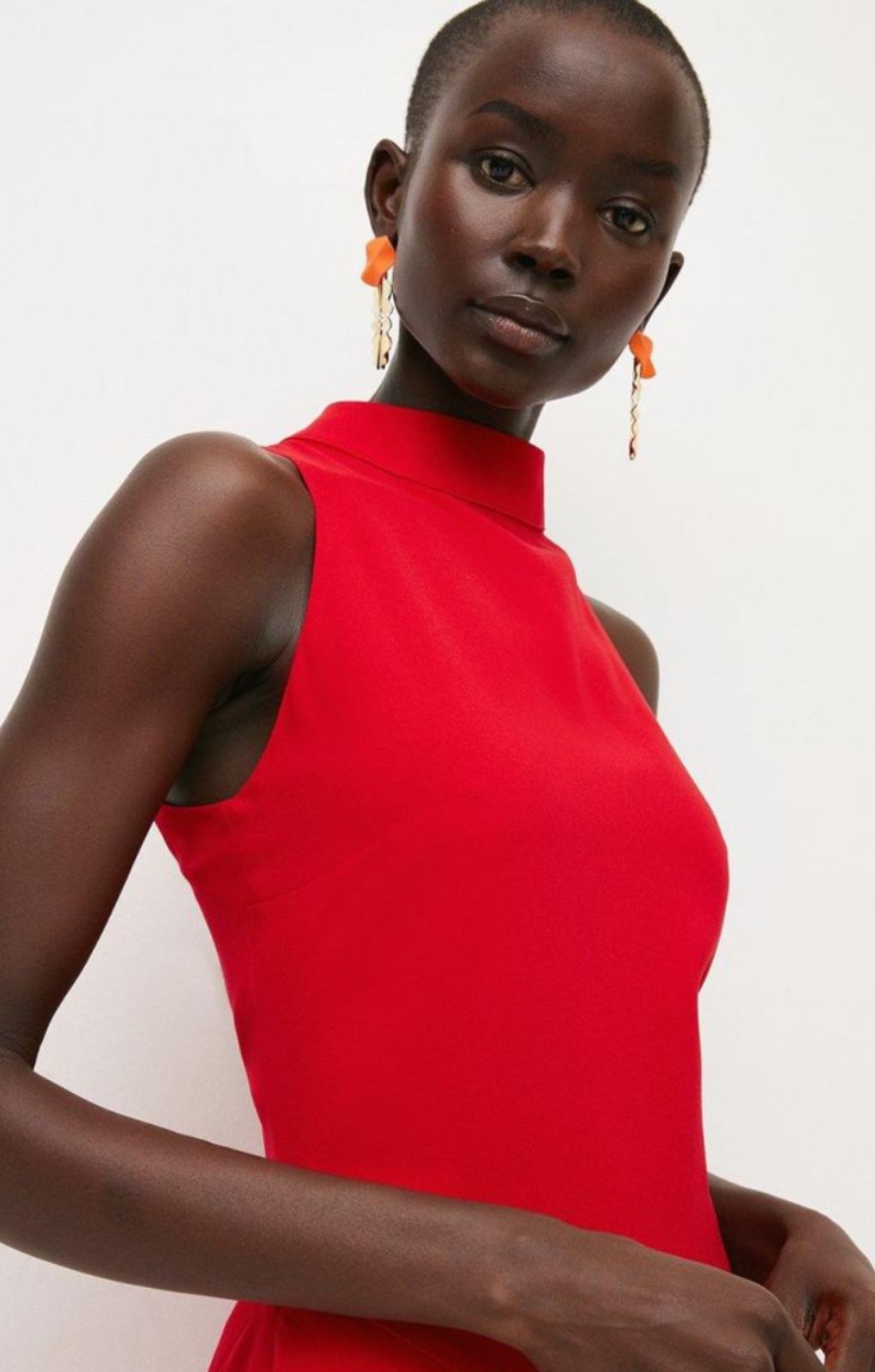 Karen Millen Red Crepe Waterfall High Neck Midi Dress