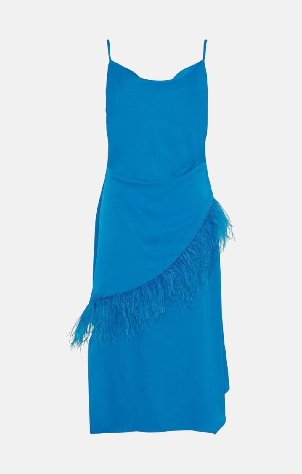 Exude modern glamour in this feather-trimmed cami midi dress from Karen Millen. Crafted from viscose satin-back crepe, it drapes beautifully while offering a luxurious sheen. Delicate straps and a feather hemline bring a touch of playful elegance — perfect for evening events or special occasions.