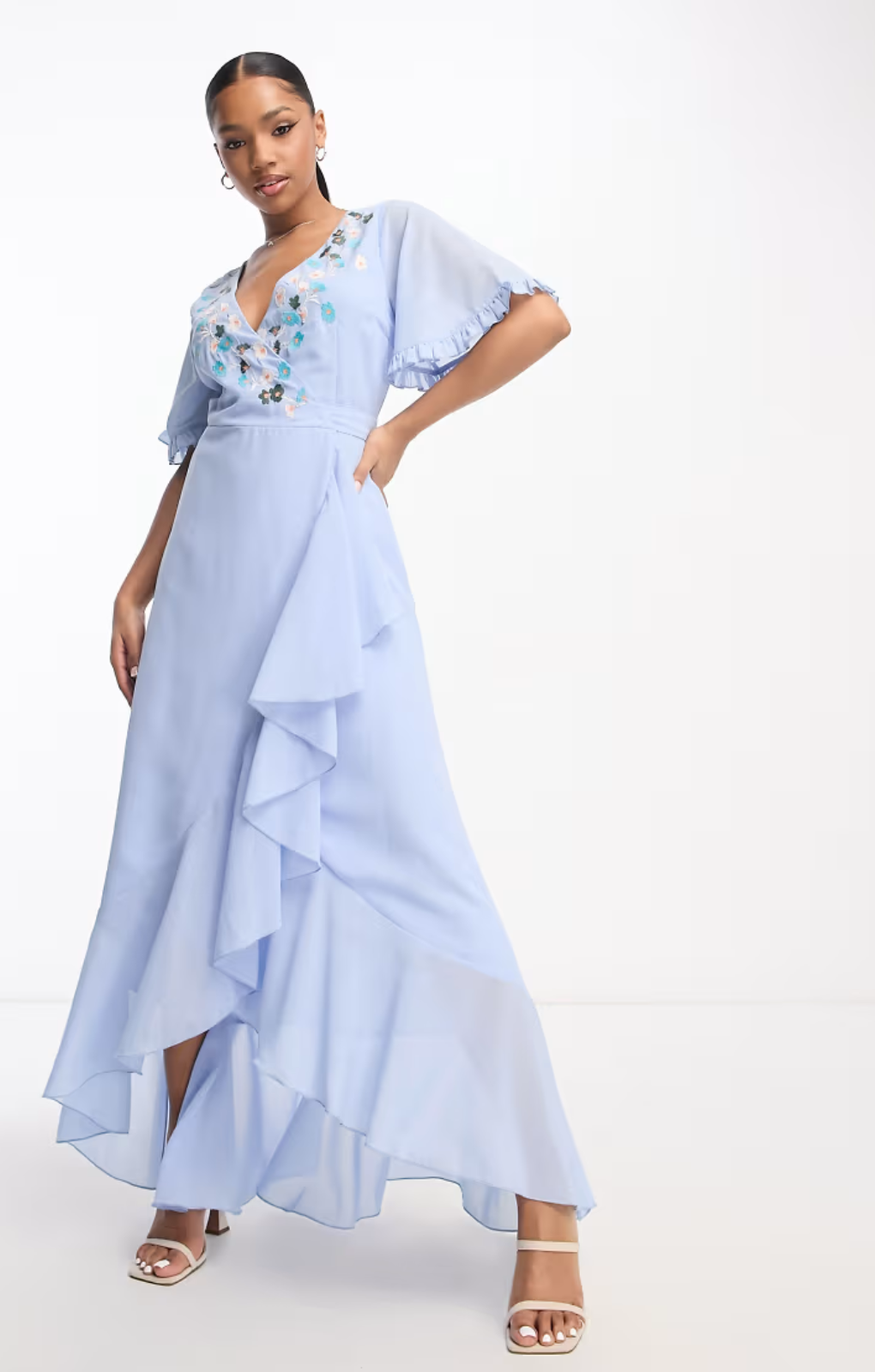 Featuring a wrap front, frill sleeves, and a tie waist, this baby blue dress is adorned with delicate floral embroidery, making it a perfect choice for summer weddings, whether as a guest or bridesmaid.