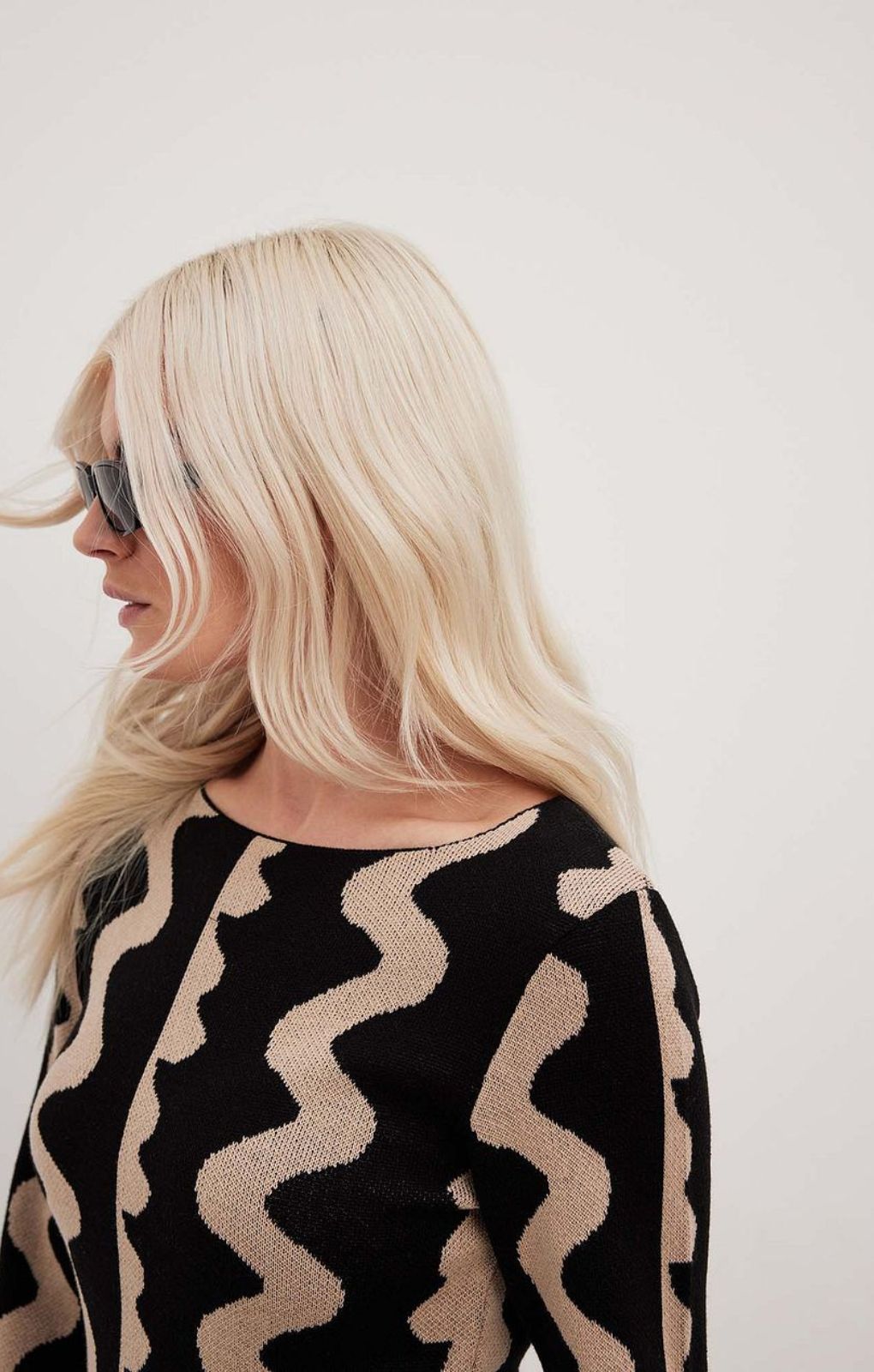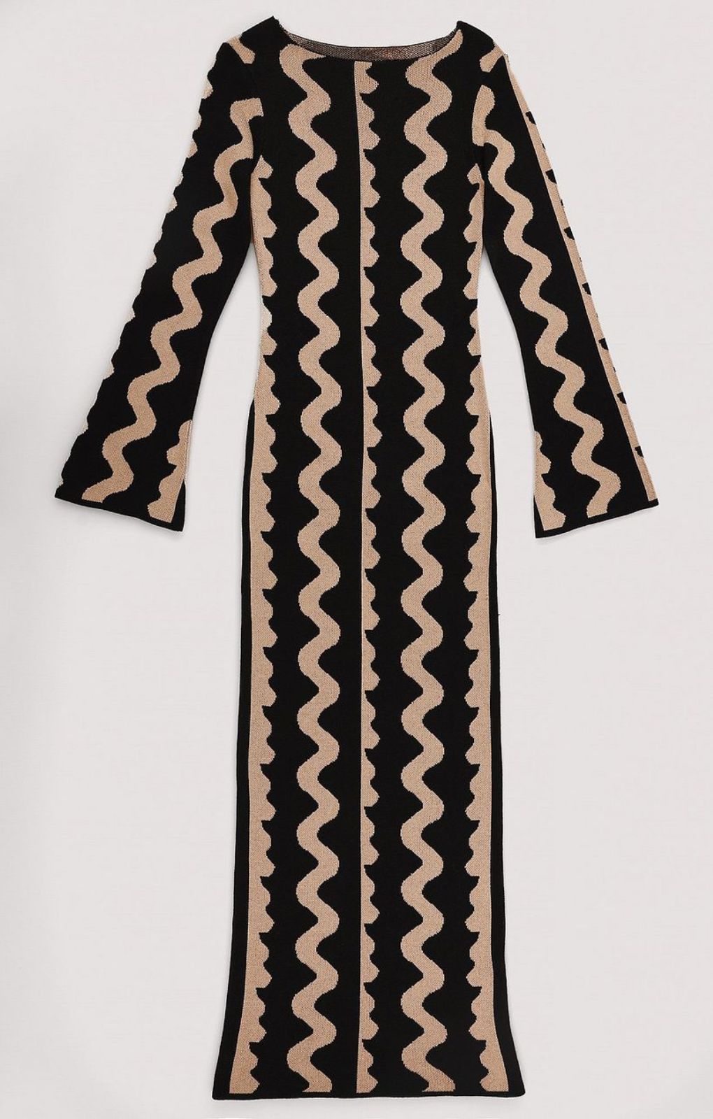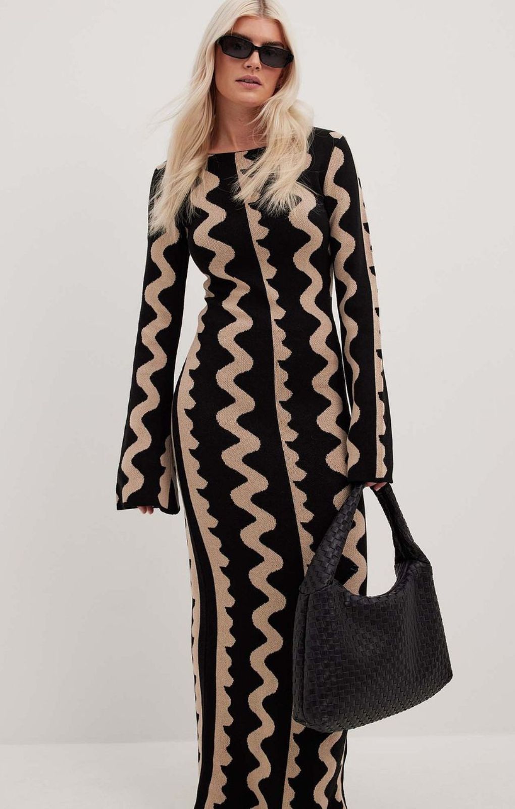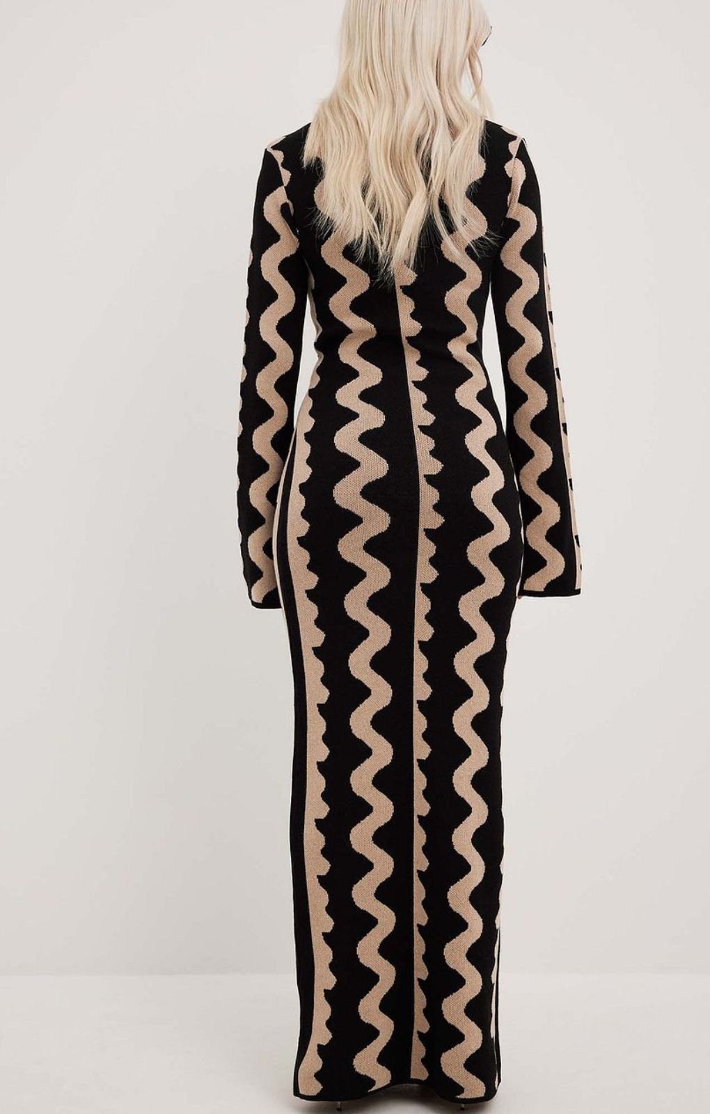This maxi dress features a ribbed neckline. It has flared long sleeves and a bodycon fit. The maxi dress has a stretchy, knitted material. This maxi dress comes in multicolor.