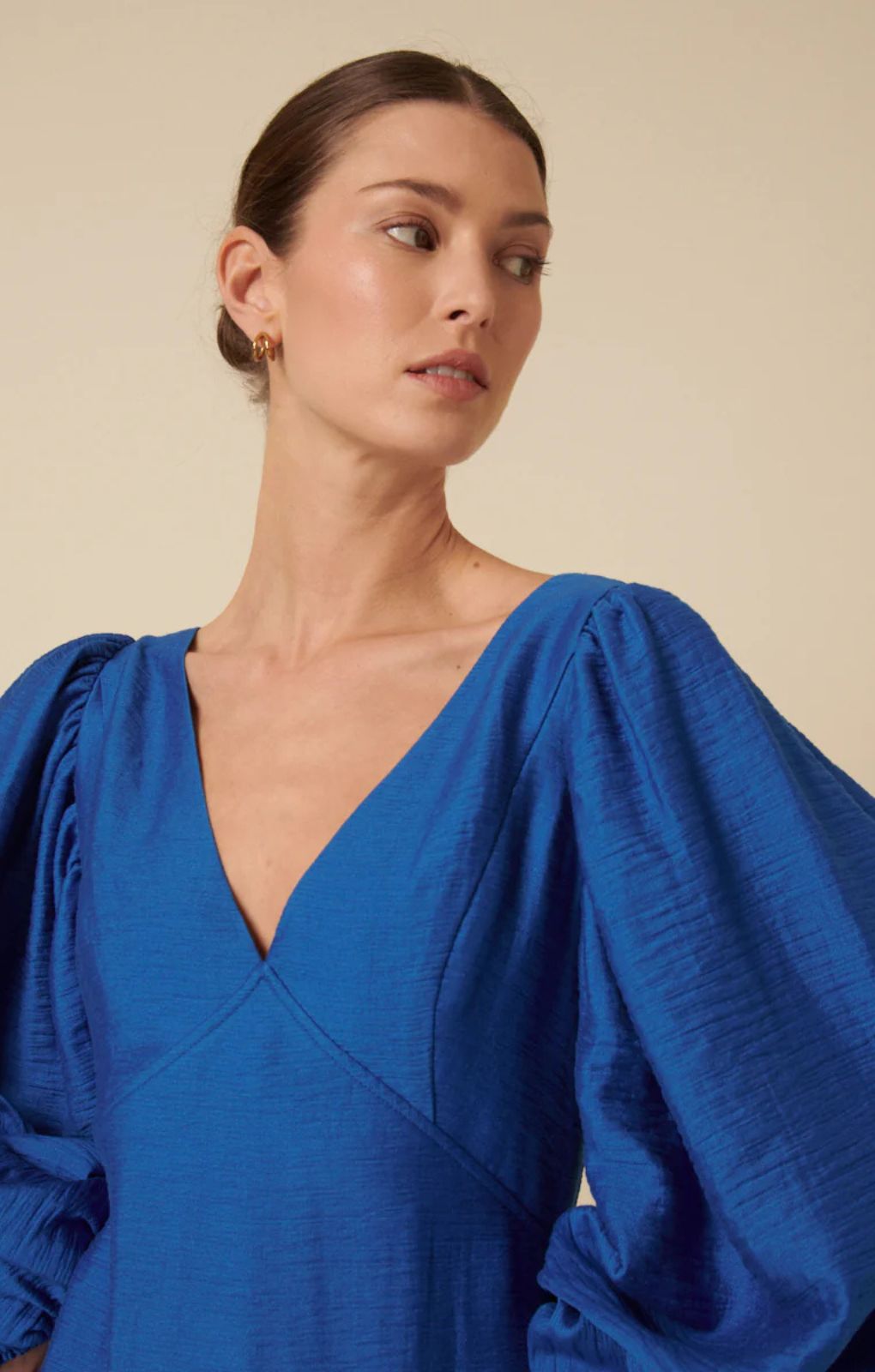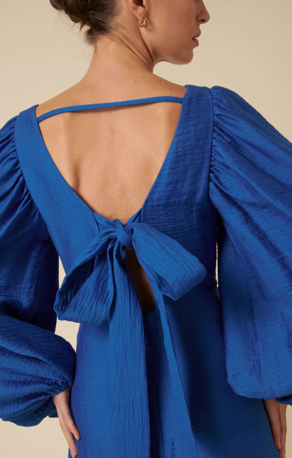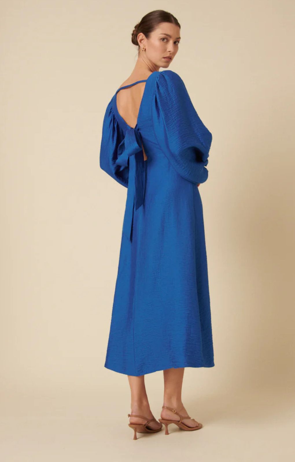 Meet Zendaya! She’s your new go-to party dress and comes in blue. We can't get enough of her flattering square neckline, billowing balloon sleeves and swishy skirt. Turn around to show off the backless detailing at the back. Wear yours with heels and gold jewellery.