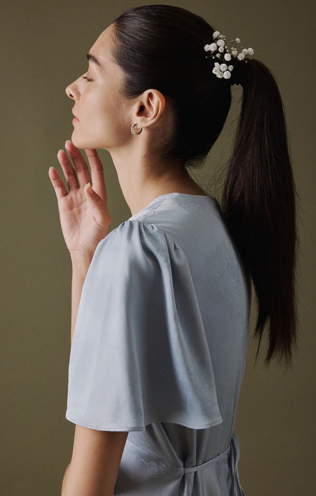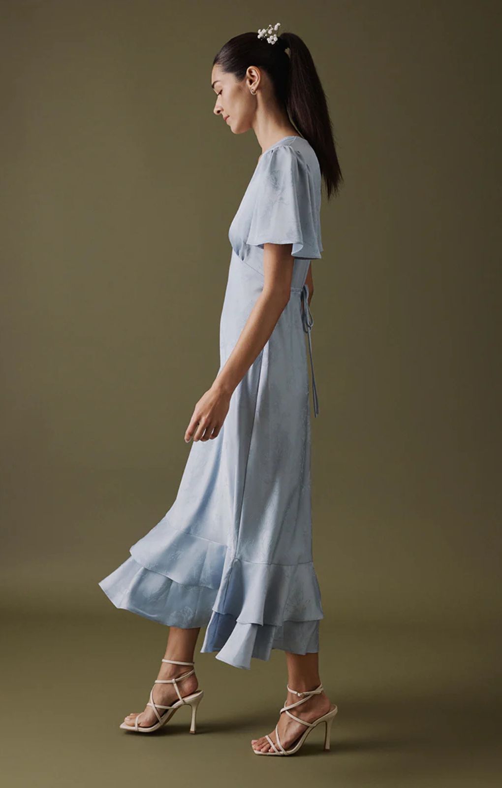 In a soft blue shade, our Alaina dress is perfect for weddings or garden parties. We love the delicate ruffled hem and short fluttery sleeves that combine classic charm with modern femininity. Style with simple heels and silver accessories
