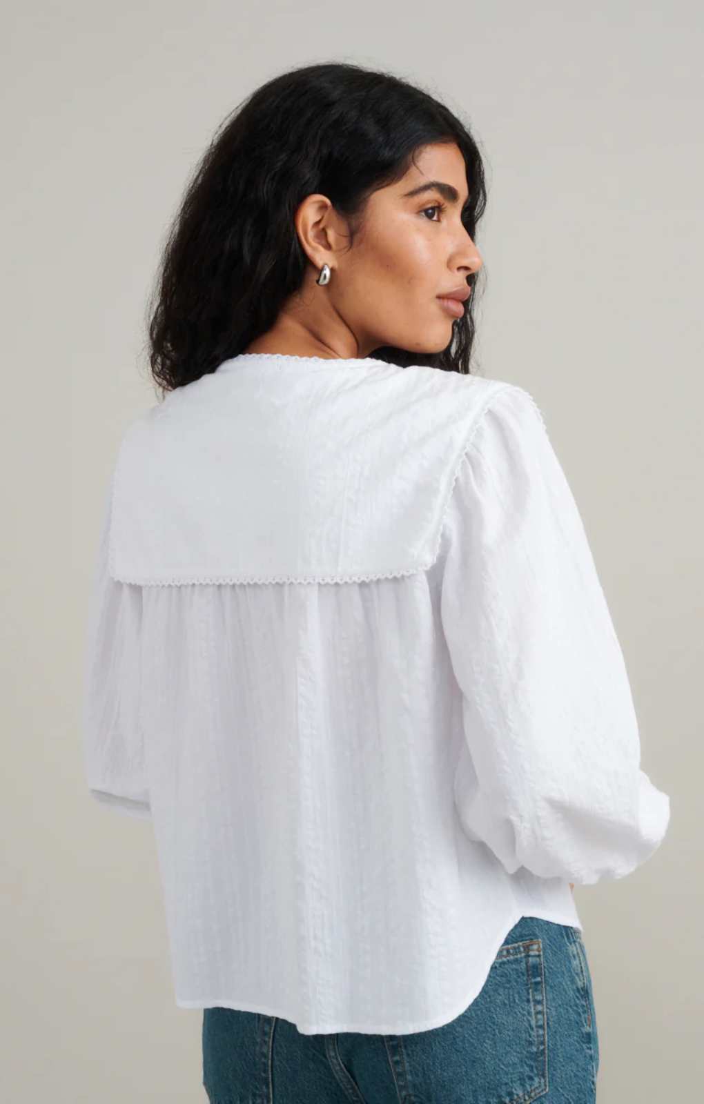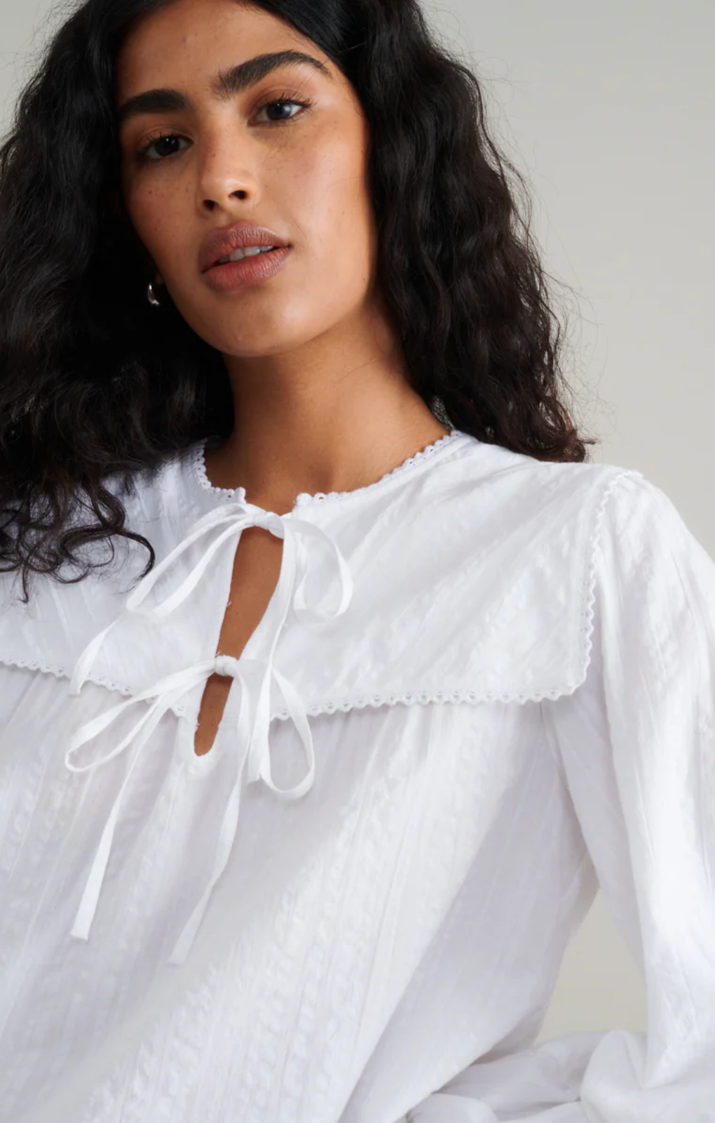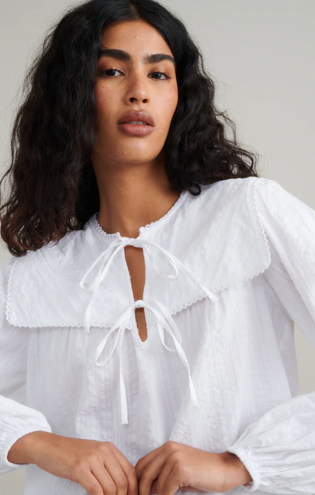 This effortlessly chic white blouse is the perfect addition to your daytime wardrobe. Featuring an exaggerated Peter Pan collar and delicate tie-front detailing, it strikes the perfect balance between vintage-inspired charm and modern minimalism. The lightweight, textured fabric and relaxed silhouette make it a go-to for casual brunching or elevated weekend wear.