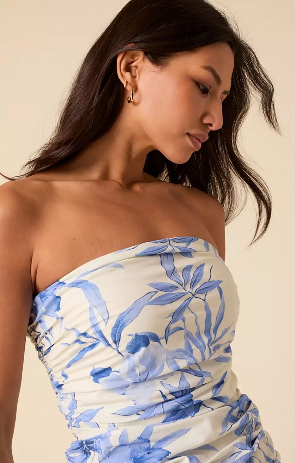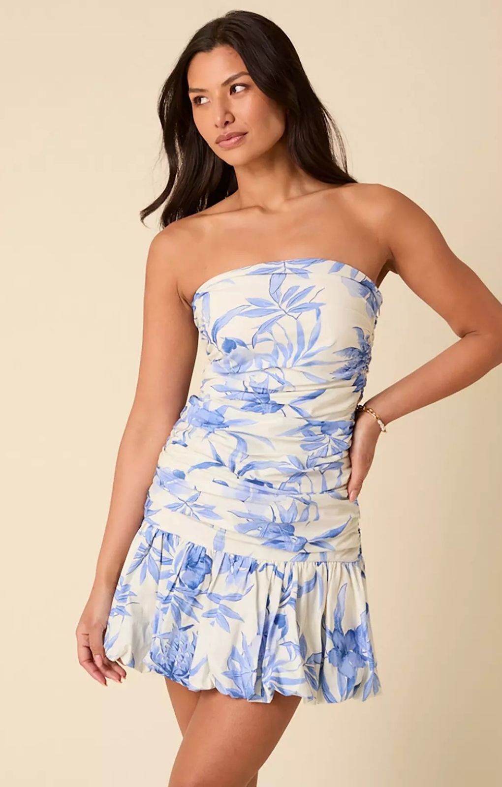 A romantic, feminine style with a playful bubble hem and pretty floral in a soft cream that's perfect for summer parties and holidays.