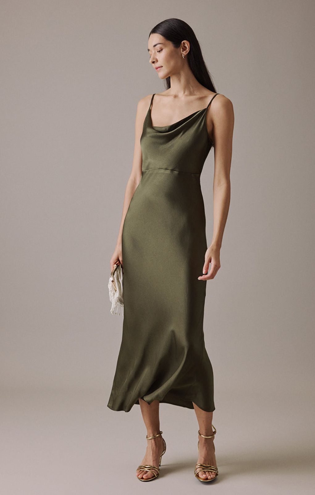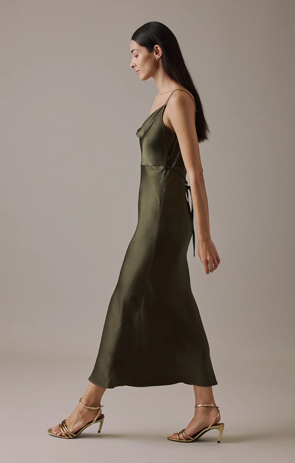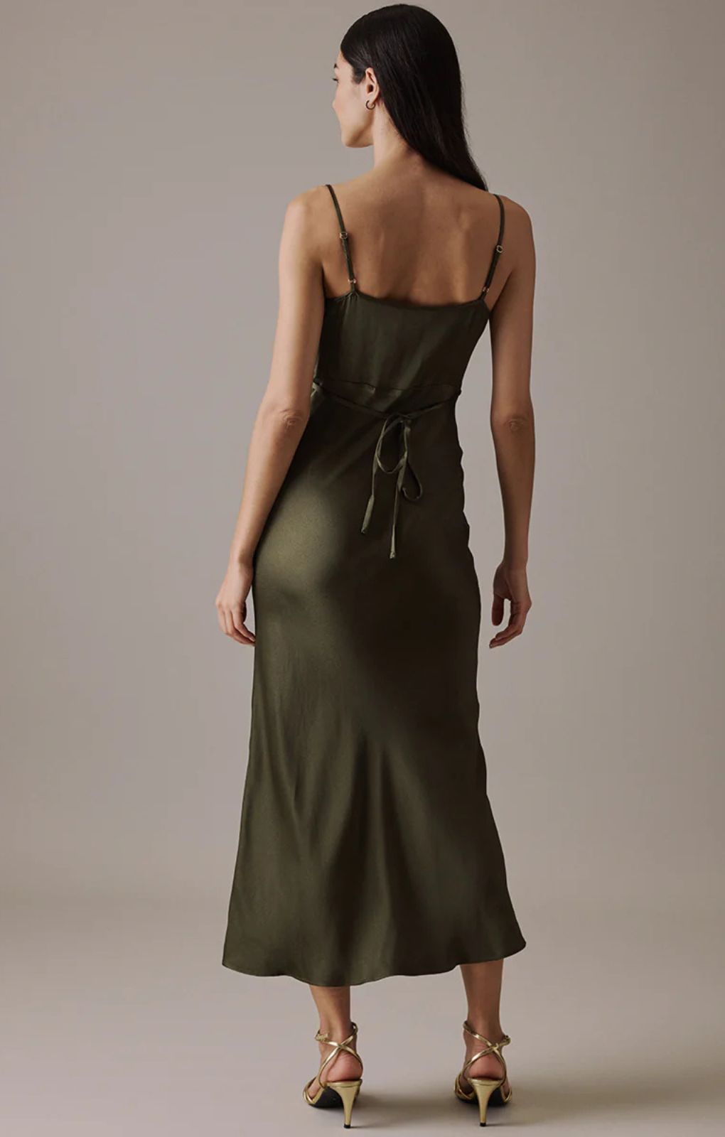Coming in olive, this slinky slip is framed by barely-there straps and a soft cowl neckline that’s perfect for weddings and far-flung destinations. Cut on the bias, the lightly flared midaxi hem is effortlessly flattering. It’s finished with pretty tie-back detail for the perfect fit. Style elegantly with strappy sandals and a gold accessories.