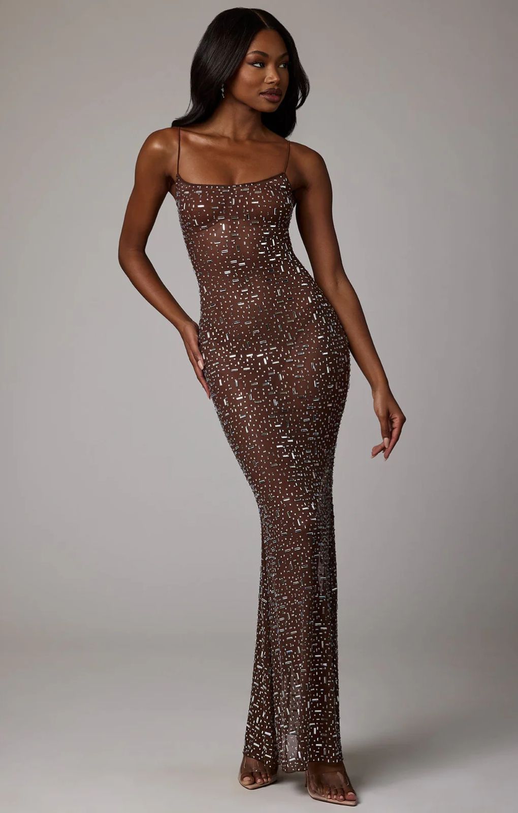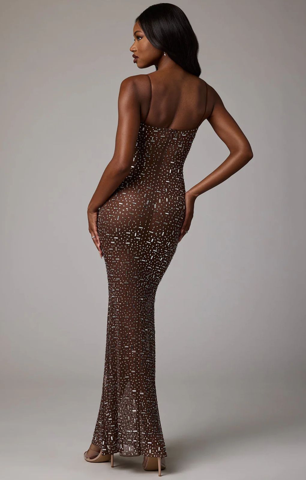 Oh Polly Antonella Sheer Embellished Scoop Neck Evening Gown in Mocha