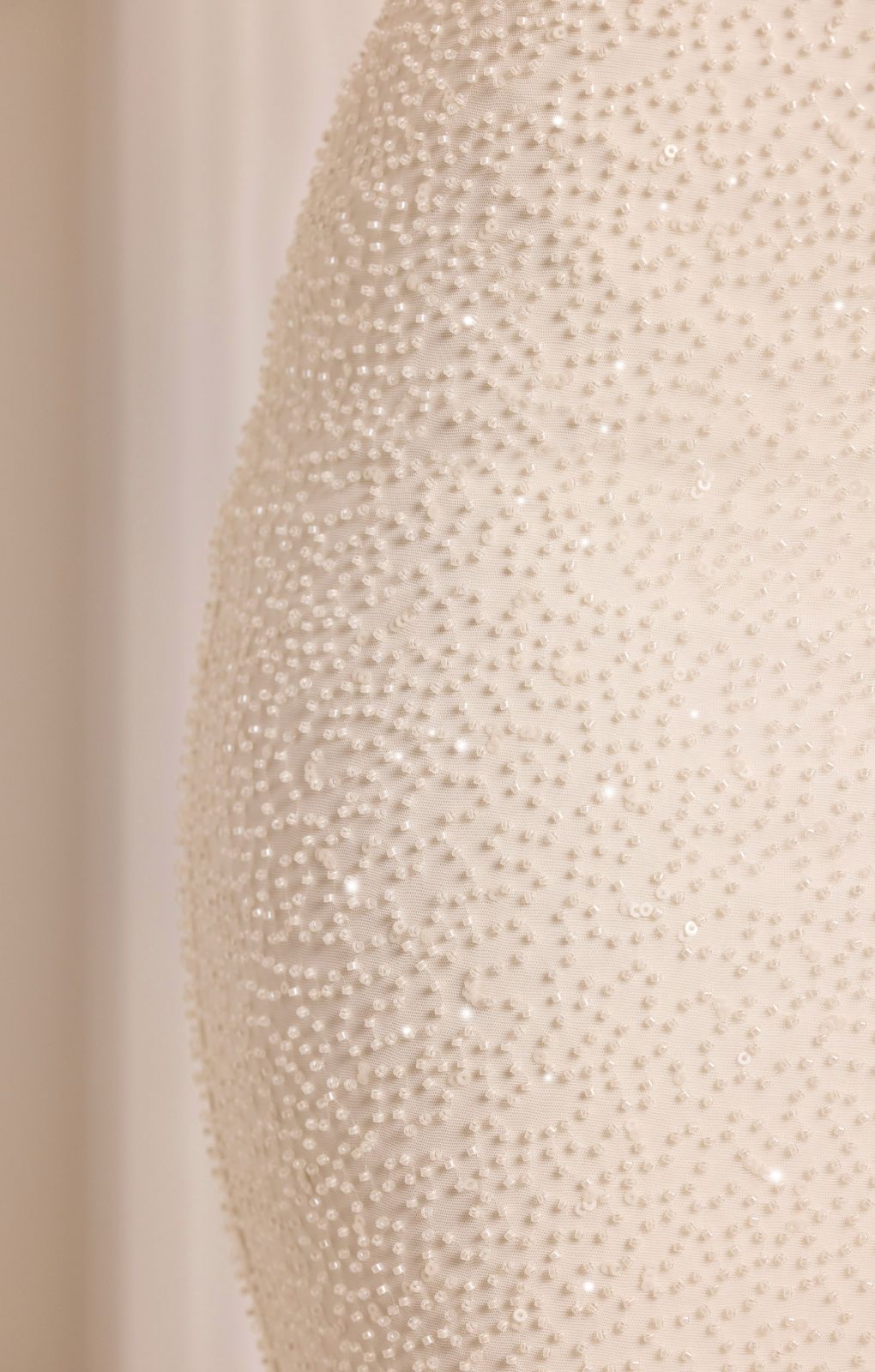 Dual layered mesh fabric with fully seeded embellishment throughout (Shell: 84% Polyester, 16% Elastane, Lining: 95% Polyester, 5% Elastane). Fully lined. This garment contains delicate artisanal hand embellishment and it is normal that overtime embellishment may become loose