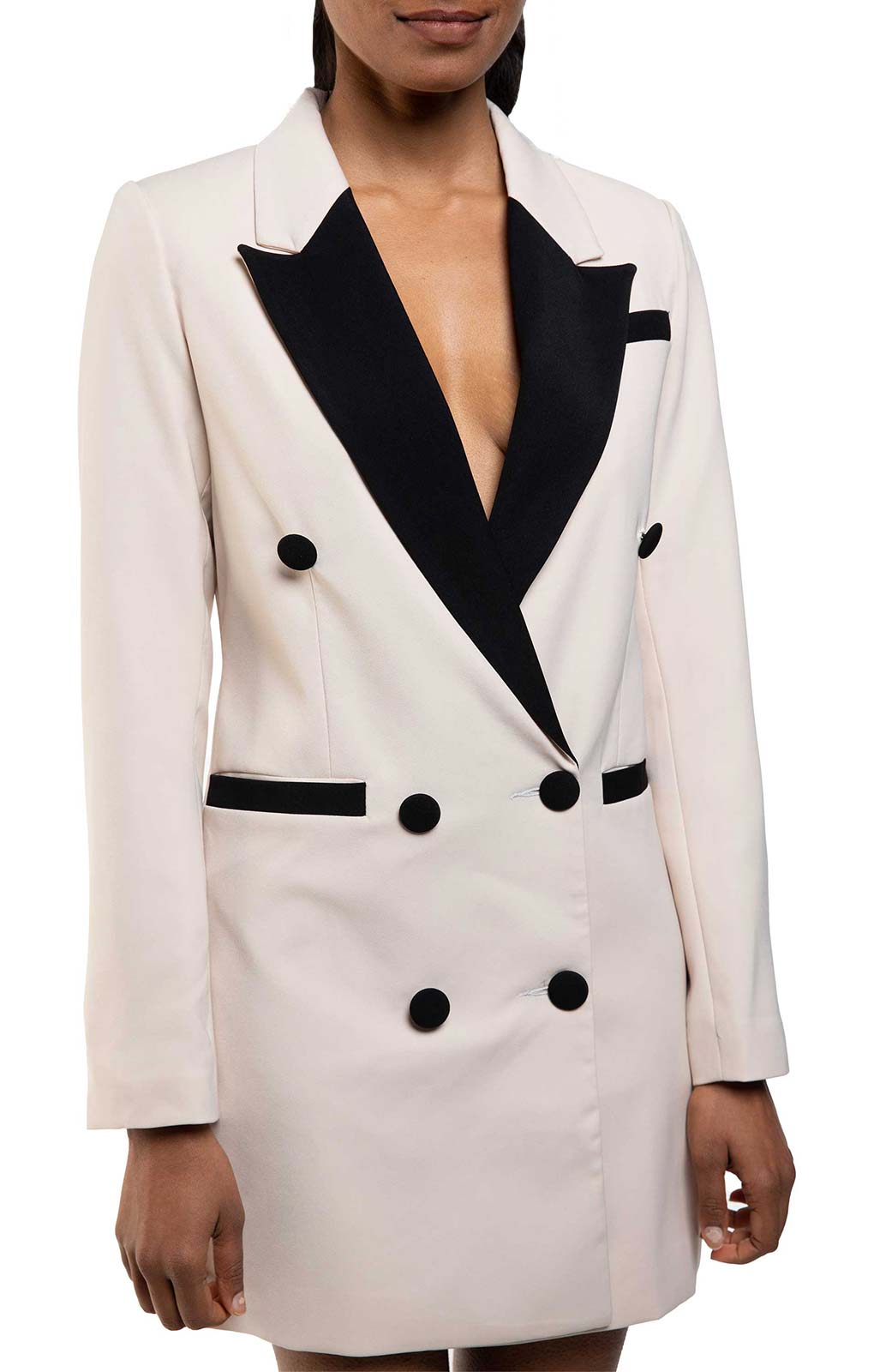 The Zoe Blazer Dress is double-breasted with contrast lapels and features a mini length, long sleeves, contrast centre-front buttons, pockets at the front, lining, a slightly relaxed fit and no stretch throughout the garment